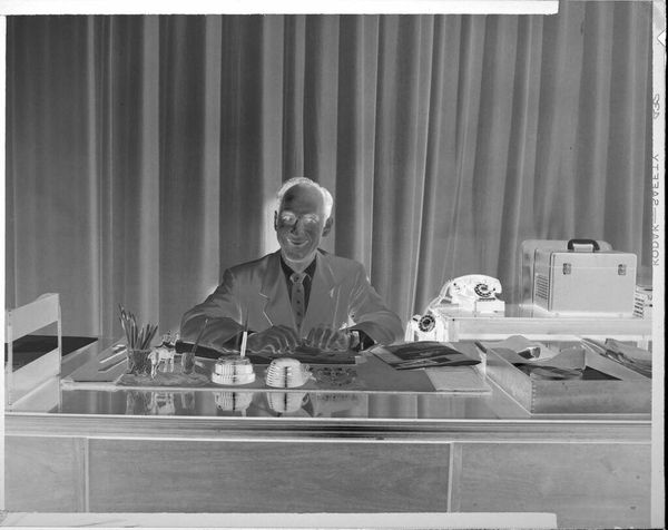 Curator: This gelatin silver print by Peter James Studio captures a man intensely focused on a map at his desk. The mood is so still, almost melancholic. Editor: The desk itself speaks volumes. It's a landscape of labor, meticulously organized. Look at the stacks of papers, the weight of all that bureaucracy! Curator: Absolutely. Considering the context of mid-20th century labor, this scene highlights the power dynamics inherent in bureaucratic spaces. What roles are accessible, to whom, and at what cost? Editor: And the map itself? A tool, a material object used for planning and control. Who gets to create and interpret these maps, and whose labor is implicated in their creation? Curator: The crisp lines of his suit juxtaposed with the softer focus on his face – it speaks to the performance of masculinity within these structures. Editor: It makes you wonder about the physical processes to create this photo, from the darkroom to the tools used. The materiality of the print itself suggests a certain kind of production, perhaps even constraints. Curator: It's a reminder of the human element within institutional frameworks. Editor: Yes, and the often invisible processes that prop them up.
