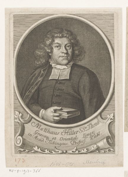 Curator: The work before us, "Portret van Ludwig von Hörnigk op 44-jarige leeftijd," an engraving by Sebastian Furck from 1644, presents a compelling example of Baroque portraiture. Editor: This piece feels very formal, almost stoic. The subject's intense gaze and the intricate details in his clothing and the surrounding ornamentation give it a real sense of gravity. What stylistic elements define this work for you? Curator: Note the precise use of line and shadow. The density of engraved lines models the forms and creates a textured surface across the entire composition. Do you observe how the oval frame, with its flourishes and inscriptions, functions as an integral part of the portrait rather than just a border? Editor: Yes, the frame feels like an extension of the subject’s personality or status, almost as if the visual language used on the portrait subject itself were bleeding into the frame and then being used to amplify the work overall. Curator: Precisely. It emphasizes the Baroque aesthetic – an interest in intricate detailing and a unified composition. The varying textures created through the engraving technique are critical; they define form and surface, light and shadow. Consider how these details, coupled with the Latin inscription, communicate specific meanings. Editor: It's like every line has a purpose, a deliberate stroke contributing to the overall impact of the portrait. It definitely makes me think about the power of details. What have you taken away from the portrait today? Curator: My primary take away from analyzing Furck's work is seeing how visual forms work as structural devices to create symbolic meaning. The density and detail tell a story.