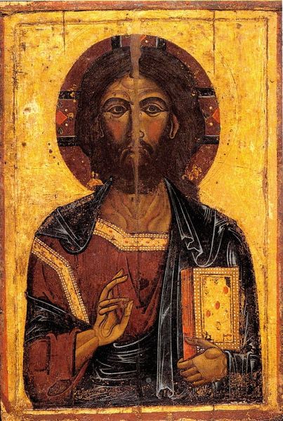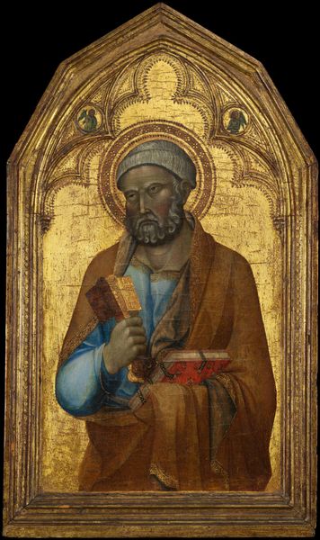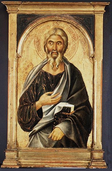 Curator: Right, let's dive into this striking piece. What we have here is a tempera painting, “Saint Nicholas,” dating back to around 1200. It resides in the Tretyakov Gallery in Moscow and represents a classic example of Byzantine art. Editor: Well, my initial gut reaction? It’s intense. There’s something so direct in that gaze. Not aggressive, more…knowing. The colours, too, have this aged, almost bruised quality about them that pulls you in. It feels both ancient and deeply present. Curator: Absolutely, there’s an arresting quality. Nicholas is depicted in the traditional iconic style, with the deliberate use of flattened perspective and stylized features, and holding the Gospel book. Notice the deliberate lack of naturalism—it's about conveying spiritual truth rather than photographic reality. How do you read his presentation here in terms of its messaging? Editor: I'm seeing a figure embedded in history, not just in a religious sense but in a temporal one. The use of gold leaf, though common in Byzantine art, adds to the layered experience: who had access to this image? Who prayed before it? What socio-economic currents does the creation and maintenance of a gilded, embellished work such as this speak of? And who were the other figures surrounding Nicholas? Are they other Saints or those who aided in production? These are things that jump out at me! Curator: Good eye! That is exactly what one must note when taking it all in. It also showcases the use of the icon as an intercessory object, not merely as a portrait. It encourages an active relationship between the viewer and the depicted saint. How do you experience that? Editor: The positioning is everything here, right? I'm thinking of that active relationship as one that mirrors other historical contexts: portraitures of Kings in court who use their visage to exude dominance. Here, the face is elongated, and dark shadows abound, not in an unappealing way, of course, but more so as to present the gravity of one's spiritual responsibilities in relation to earthly sins. There’s a responsibility and perhaps a burden. What do you think? Curator: I find it incredibly compelling. There's something profoundly human in this holy image. I can almost sense the weight of responsibility in those eyes. What resonates is its enduring power, transcending centuries to still speak to something essential within us. Editor: Indeed. And when we look at a piece like this, we are never just looking at pigment and panel. We are face-to-face with history and our shared human heritage of belief, struggle, and creation.
