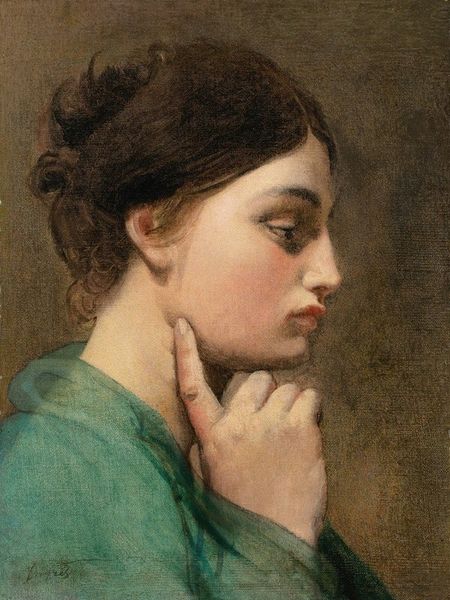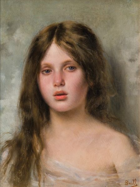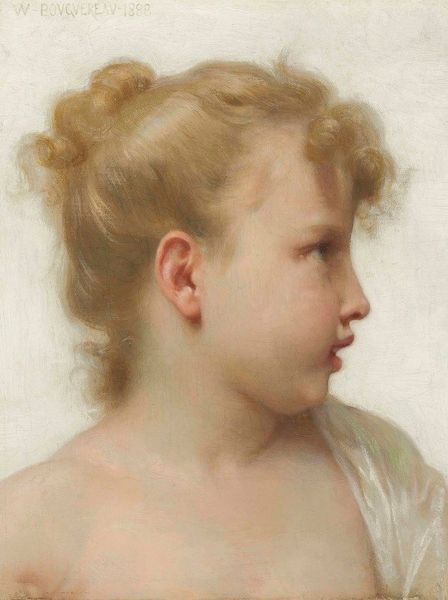 Curator: Before us hangs William Bouguereau's "Portrait De Jeune Fille," an oil on canvas completed in 1898. What are your initial impressions? Editor: A profound sense of melancholic introspection pervades this canvas. The young woman's downward gaze evokes a hidden world of emotions. Curator: Indeed. The formal construction emphasizes her inwardness. Note how the artist uses soft, diffused lighting and a muted palette to direct our gaze toward her face. The limited chromatic range, primarily subtle greens and blues, reinforces this mood. Editor: The choice of such soft hues adds to her ethereal quality. Blue, often linked to purity and introspection, combined with the braided crown, elevates her to an almost saintly presence. It is intriguing to consider how Bouguereau consciously utilizes these visual cues. Curator: I find it compelling how Bouguereau merges academic technique with a Romantic sensibility. Observe the precise rendering of the skin tones against the indistinct background. This juxtaposition creates a striking figure-ground relationship that is fundamental to the composition. Editor: Absolutely. And culturally, images like this created an idealized representation of feminine innocence during that period. Her quiet demeanor speaks volumes about the societal expectations placed upon young women at the close of the 19th century. It represents the icon of youthful virtue, and it is certainly a common image that reflects and reinforces it. Curator: That intersection of formal execution and cultural symbolism deepens our understanding, revealing not just skill but conscious meaning-making. Editor: It highlights how symbols and compositions blend to shape our understanding of beauty and social roles, making her poignant in her imposed serenity. Thank you for illuminating how that reading manifests here. Curator: And thank you, for uncovering a compelling iconographic reading that resonates deeply.