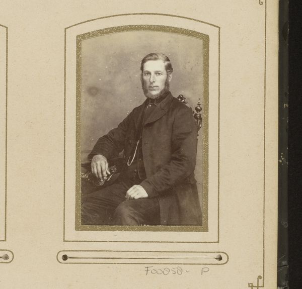 Curator: Oh, there's a contemplative air to this daguerreotype; almost melancholic. The man seems caught in a moment of quiet contemplation. Editor: This is "Portret van een man bij een tafel met boek," created sometime between 1857 and 1864. What we are looking at here is not just a portrait, but a slice of bourgeois life carefully captured in photographic form by Wegner & Mottu, who had a keen eye on social representation. Curator: Slice is the right word! The man with a book--the very image of bourgeois respectability. And he’s rather stylish for it. I get the sense he knows he's being immortalized, which, of course, puts one on one's best behaviour, doesn't it? I wonder what his own relationship to books and knowledge actually was. Did he love them, or was it a prop? Editor: These early photographic portraits served very specific purposes. Daguerreotypes were luxury objects, initially displayed in the home to project status and solidify familial memory. And because they required long exposure times, there was no escaping the fact that getting one's picture taken was itself a socio-economic event. Curator: Yes, but what strikes me now is the patina, that faded amber glow that time gives. It’s the visual equivalent of memory itself. The fragility of the image adds an emotional weight that would have been very different in 1860. He's not a man frozen in amber; the whole scene is amber. Editor: Indeed, that amber tone, as well as the style of presentation in this ornamental border suggests that this portrait existed within an album. Looking at the larger cultural function of these albums within family structures offers insight into victorian social constructs of respectability and private life. And you see such class aspirations embodied so plainly in his confident pose and surroundings! Curator: It makes me think about all the unseen hands that went into creating it – from growing and weaving the fabrics, to grinding the lenses...And the knowledge held by Wegner & Mottu...We have our faces blasted across screens and hard drives; and here is one silvered on glass. Editor: And considered from an even wider angle, consider the power of visual imagery in disseminating new class and aesthetic ideals among a growing middle class; consider its connection to colonialism...These portraits do so much cultural work. Curator: All from one face! That's art isn't it: the small containing the immeasurable? Editor: It really is! Now, to the next treasure.