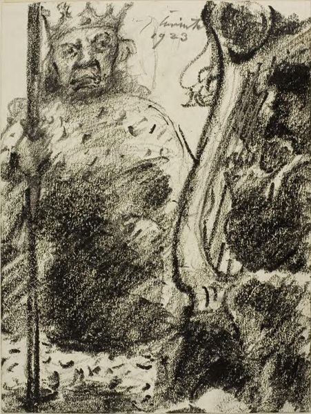 Curator: Lovis Corinth gifts us "King David Sings to the Lord," held at the Harvard Art Museums. There's no date listed, but Corinth lived from 1858 to 1925. Editor: My first impression is somber. The charcoal rendering seems to weigh down the figure, giving him a palpable sense of burden. Curator: I agree. You know, I've always felt David's story is one of divine favor intertwined with profound human struggle. Corinth really captures that duality with the dark strokes contrasted against the white of the paper. Editor: Absolutely. And consider the harp, almost an extension of David himself. The vertical lines, so rigidly placed, are a kind of structural lament. It's a masterful use of formalism to evoke emotion. Curator: Yes, it gives me the sense that even in praise, there's a recognition of life's hardships. The song, like the charcoal, is raw and unfiltered. Editor: It really underscores how formalism, at its best, reveals the soul of a piece, not just its surface. Curator: And the soul of the artist. I think Corinth understood David's turmoil, and somehow, put it on paper. Editor: A truly moving visual interpretation.