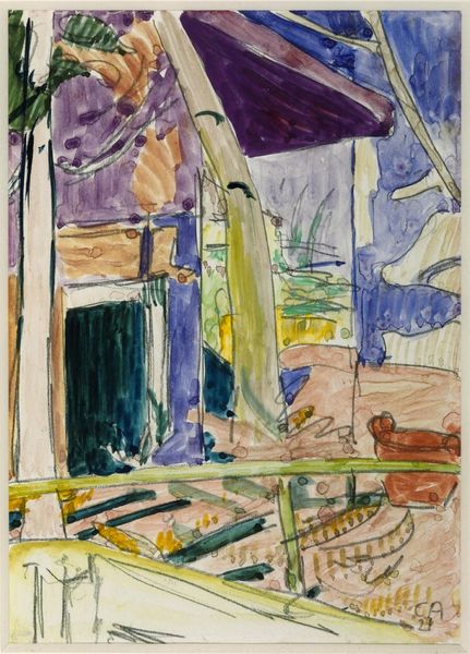 Editor: So this is Edvard Munch's "The Tram Loop At Skøyen," painted sometime between 1920 and 1930, using oil paint. The colours are amazing; there’s something so unsettling, almost jarring about the cool palette in an outdoor landscape. What do you see in this piece? Curator: It's interesting you mention "jarring," because for me, this work speaks to the disruptions of modernity. Look at how the stylized trees, almost ghost-like, seem to both obscure and reveal the urban landscape behind them. Consider how Munch, living in a rapidly changing Oslo, might have been grappling with industrialization and its effects on nature and the collective psyche. Do you notice how the tram loop, a symbol of progress, is relegated to the background? Editor: Yes, the tram is literally in the background. It feels almost… ominous. Is it a statement about urban development? Curator: It's not a simple statement, but more like a question posed. The painting prompts us to ask: What is gained and what is lost when we prioritize progress over the natural world? And for whom is this progress intended? Who benefits, and who is marginalized by this new landscape? The expressionistic style itself mirrors this anxiety. Editor: The skewed perspectives, the almost clashing colors, the visible brushstrokes… it's not a comforting landscape, is it? Curator: No, it challenges the traditional notion of landscape as a picturesque scene. It acknowledges the complex relationship between humanity and environment, progress and tradition. Perhaps the painting asks us to examine our own complicity in this transformation, the way we are all caught in the "loop" of modern life. Editor: This makes me look at it completely differently. It is much more than an image of some trees; it embodies a sociopolitical point of view, even a critique! Curator: Exactly. Munch gives us a lens to contemplate the anxieties of modern life. Editor: I’ll definitely think twice about a pretty landscape now.