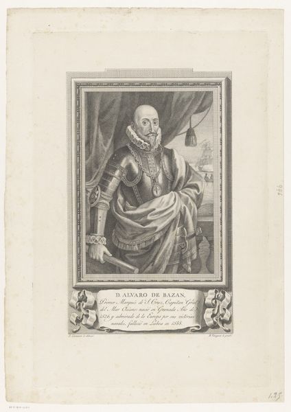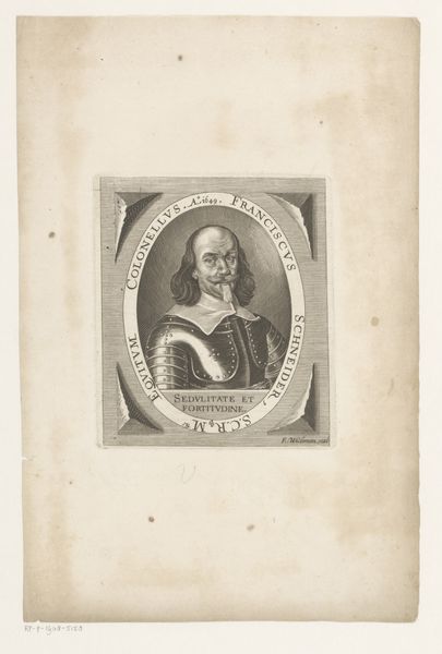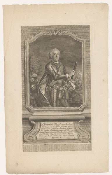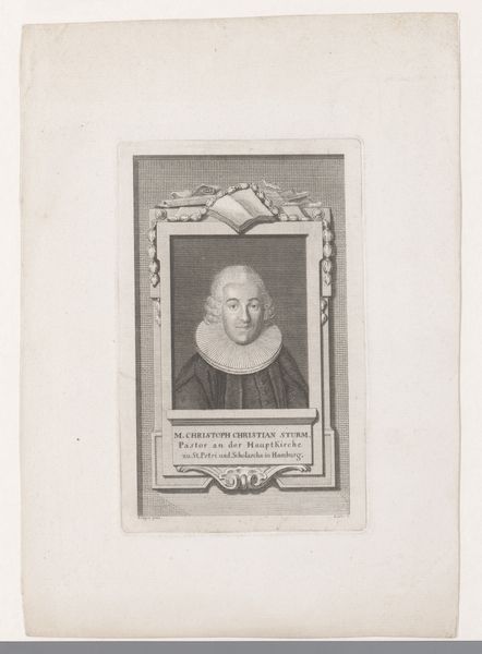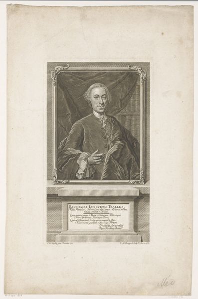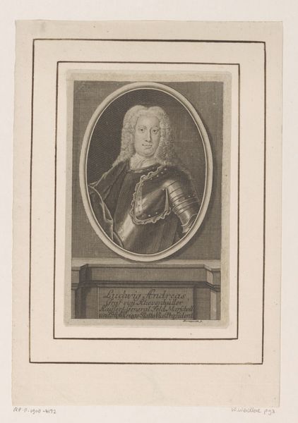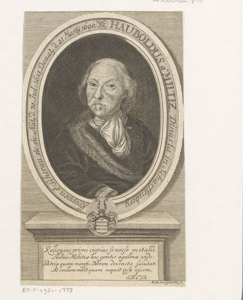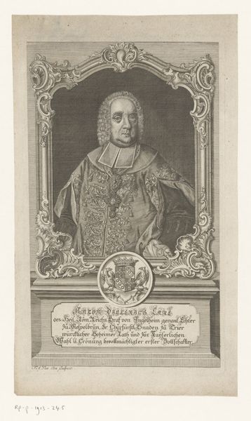 Editor: Here we have Johann Martin Bernigeroth's engraving, "Portret van Jakob Ernst von Liechtenstein-Kastelkorn, aartsbisschop van Salzburg," made sometime between 1745 and 1767. It strikes me as a very formal and somewhat austere portrait. What elements of its composition stand out to you? Curator: Immediately, the precise, controlled lines catch the eye. Notice how the artist employs hatching and cross-hatching to build tonal variations and describe the textures of the Archbishop's garments. Consider the rigid geometry: the rectangle enclosing the oval portrait. These hard lines contrast with the softer, curving lines describing the Archbishop himself. Editor: That’s a keen observation. I hadn’t considered the interplay between the geometric frame and the more organic figure within. What about the limited tonal range? Curator: Indeed, the absence of strong chiaroscuro flattens the image. We must remember that engraving, as a reproductive medium, often prioritized clarity of line and detail over dramatic light effects. Focus, if you will, on how the engraver articulates the details of the face, the slight wrinkles, the pursing of the lips. Note how those lines define his character as powerfully as any spotlight might. Editor: So the impact isn't necessarily in dramatic shading but in the subtle accumulation of details achieved through the engraving technique. The detail in his expression conveys such presence, even without a dynamic range of shading. Curator: Precisely. By engaging with this method, the artist compels us to closely observe and extract meaning through an appreciation of technical skill. I find myself intrigued by the engraver’s delicate craftsmanship. Editor: It is fascinating how focusing on technique can reveal so much. Curator: Yes. Close inspection illuminates the inherent formal properties that shape the work's communicative power. A study in lines!