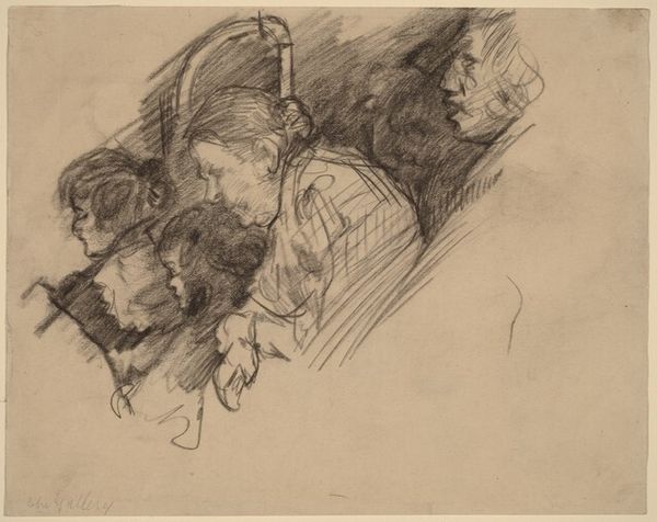Curator: Right, let’s dive into James Ensor's drawing, "Mordecai's Triumph," created between 1885 and 1886 using pencil on paper. It's a real window into his early exploration of light and shadow. What springs to mind for you, at first glance? Editor: What jumps out is the raw intensity—almost feverish, with this swirl of figures rendered so frantically in pencil. It gives the sense of chaos and unrest. Curator: I agree! The sketch certainly buzzes with energy, doesn't it? The composition, though, has such dynamism—all these lines converging towards a central, perhaps celebratory, scene. You notice how he plays with depth? Figures in the back fading into almost ghostly apparitions while those at the front possess that bold urgency? Editor: Yes, it creates a layered effect both spatially and emotionally, hinting that Ensor's intention extends beyond a literal description to explore underlying tension and perhaps irony through semiotic overload in representation of this theme. The exaggerated expression add further significance and visual meaning for interpretation! Curator: And given Ensor's later work with masks and grotesque figures, you can already see those seeds here—the faces are incredibly expressive, teetering between joy and madness! "Mordecai's Triumph", if you know the story, is about a man elevated and honored—but the faces he has given them have such complexity. Is it really honor or barely concealed madness. It poses those kind of questions. Editor: Absolutely. Also note Ensor's adept use of line to create tone. It lends itself perfectly to the expressive quality central to this style. With an artist like Ensor we tend to read expressionism in his handling of light in terms of revealing how a modernist work operates as pure play—foregrounding, again and again, artifice over and against the real, especially through subject selection, formal elements, composition strategies Curator: It really is a captivating piece, this snapshot into Ensor's artistic mind as he moved away from traditional representation, heading toward the world of pure sensation. Editor: It gives a glimpse into the makings of what would become his uniquely radical style - with hints that things are not always as they may at first appear!