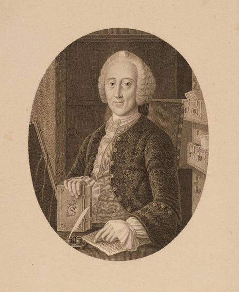 Curator: We’re looking at an engraving from 1784 entitled "Portret van Jan Jacob Elsevier," attributed to Reinier Vinkeles. It’s a meticulously detailed portrait. What's your initial read of it? Editor: I’m struck by the sense of contained power—a certain stateliness framed by stone and symbolic objects. There's a gravitas communicated in every line. Curator: The oval framing is interesting, isn't it? It mimics the shape of a classical cameo. This device serves to elevate the sitter, Jan Jacob Elsevier, imbuing him with a timeless quality and also acting as a form of classical artistic referencing. It creates an architectural stability to contain a portrait. Editor: Absolutely. Elsevier, given his titles etched beneath his likeness, council member and colonel of Rotterdam, seems acutely aware of his status. Even his slightly asymmetrical gaze invites confidence but also demands deference. I notice a mace resting prominently—is that a symbol of civic or military power? Curator: Precisely. It visually affirms his authority as the engraving immortalizes him, ensuring both present viewers and posterity recognize his significance. Notice also the lion motif beside it—that references strength. Editor: Yes! The lion coupled with what looks like heraldry suggests a narrative rooted in historical, perhaps even familial, symbolism of Dutch values. Also, that hat on the table indicates the position of an elite within Dutch society. Everything emphasizes a conscious performance of power and authority. Curator: And how Vinkeles executes this! Observe the contrast between the textures--the smoothness of Elsevier's face against the elaborate curls of his wig, or the defined detail in the lion emblem, versus the smoother stonework. All done solely through linear mark-making, emphasizing light and shadow. Editor: What I appreciate is the layering of symbols; the piece does not settle with portraying only the figure, but instead provides several artifacts relating to who he was, what he stood for, and ultimately his role in society. This offers layers of meaning which, in combination, reinforce the impression that he’s an accomplished civic and military person. Curator: Agreed, the piece utilizes careful design, perspective, and symbol-set to make a solid representation. It delivers, without fail, on a specific societal moment, attitude, and value system. Editor: Indeed. This portrait freezes not only Elsevier’s likeness, but the entire system propping him up. Thank you, a revealing discussion!