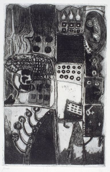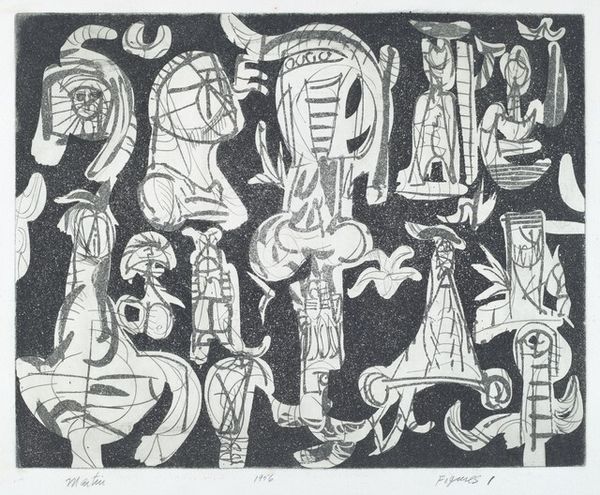 Curator: Professor Karl-Otto Götz created this evocative piece, "Gilgamesh." Editor: My first thought? These biomorphic forms, reminiscent of cave paintings, feel ancient, primordial. Curator: Götz was a key figure in postwar German abstraction. His work often explores the subconscious, the primal, in reaction to the horrors of war. Editor: The composition is quite compelling. The arrangement of these glyph-like figures creates a strong sense of rhythm and visual balance. Curator: He’s tapping into that ancient narrative, the epic quest for immortality. It reflects the human yearning to transcend our limitations. Editor: The stark monochrome palette enhances the feeling of antiquity, wouldn't you agree? I also notice the contrast in textures. Curator: It reminds us that even the most abstract forms can carry profound cultural weight. Editor: Indeed. It's a fascinating collision of the archaic and the modern.