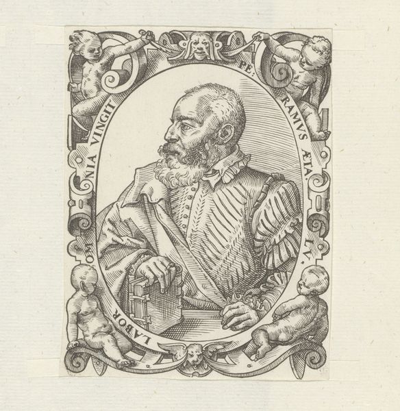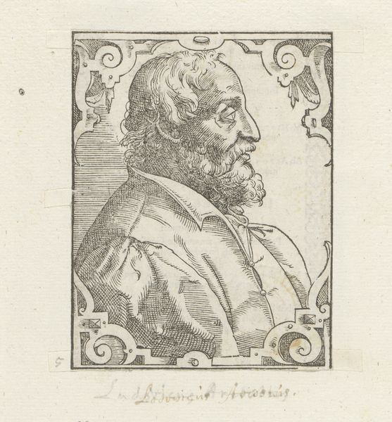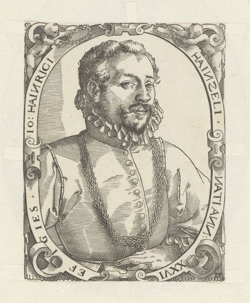 Editor: Here we have an engraving, "Portret van Karel de Grote," or "Portrait of Charlemagne," dating back to sometime between 1549 and 1575, made by an anonymous artist. The fine lines give it a delicate yet authoritative feel. What strikes you most when you look at this image? Curator: I immediately see how symbols are used to construct and convey power. Notice how Charlemagne is framed – not just within the circular border, but also by the intricate designs on his garments. This creates a visual language, almost like a halo, that emphasizes his authority and reinforces his cultural significance, centuries after his reign. What message do you think that visual emphasis conveys to its audience? Editor: I guess it is a way to solidify his image as an important historical figure, but aren't the symbols mostly decorative? Curator: Not at all. These decorative elements, particularly the repeated geometric patterns, evoke a sense of order and divine right, crucial for rulers. Think about the power of repeated imagery, and its role in psychological impact – we see it across many cultures and religions. It creates a visual mantra, embedding Charlemagne’s power within the viewer’s consciousness. Editor: So it’s not just about pretty patterns, but a deliberate attempt to shape perception? Curator: Exactly. The visual cues tap into deeper cultural memories. The symbols associated with Charlemagne’s era link him to specific ideas of governance, religion, and imperial power. The image creates a chain reaction of associations, building a narrative that speaks of legacy and influence. It prompts us to consider how history is visually constructed and consumed. Editor: It’s amazing to think how much meaning can be packed into what I initially saw as just an old engraving! Curator: Indeed. And every line, every symbol, contributes to constructing his lasting presence in our minds. The past continues to speak, doesn't it?