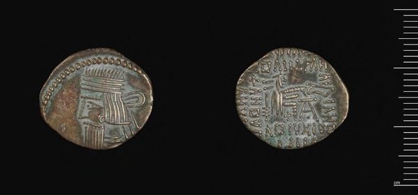Curator: Here we have a Drachm of Vologeses II of Parthia, a silver coin now residing at the Harvard Art Museums. Editor: It's striking, even in its eroded state. The bas-relief imagery possesses a certain gravitas. Curator: Indeed. The coin depicts Vologases, his regal headdress a potent symbol of Parthian authority and continuity. It speaks to the divine right of kings. Editor: The composition is fascinating. Notice the intentional placement of the royal bust, nearly breaching the circular boundary, creating a sense of dynamic energy. Curator: These coins were, in essence, miniature billboards, disseminating the ruler's image and validating his legitimacy throughout the empire. Its symbolism is a powerful form of communication. Editor: The object's material presence, its age and wear, imbue it with a tangible history. The worn surface adds a layer of visual complexity. Curator: Reflecting on this object, I'm struck by how artifacts like this bridge the personal and the political, inviting reflection on power, representation, and cultural identity. Editor: Yes, examining its composition and texture prompts questions about value, circulation, and the impermanence inherent in material objects.