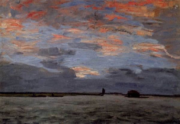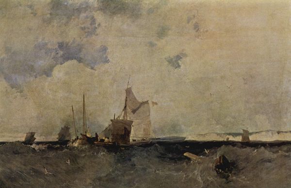 Editor: Here we have "The Adriatic Coast," painted by Richard Parkes Bonington in 1826. It's currently housed in the Louvre. The hazy brushstrokes and muted colours create this sort of melancholy feeling, like a storm's just passed. How do you interpret this work? Curator: Oh, it whispers stories to me, doesn’t it? That sky! Look at those brooding clouds – they're like emotions given form. Bonington’s skill isn’t just in replicating the scene, but in capturing the feeling of being small, yet connected to something vast and powerful. What strikes you about the solitary figure in the boat? Editor: I noticed them right away! It adds to the sense of loneliness, perhaps? Or maybe contemplation? Curator: Both, perhaps. Imagine being adrift like that, caught between the immense sky and the mysterious depths of the Adriatic. It’s Romanticism at its core – that yearning for the sublime, the overwhelming force of nature that dwarfs us. Did you know Bonington was a master of *plein air* painting? He was right there, battling the elements! Editor: Painting outside like that sounds so challenging, especially with oils. You can really feel that energy in the work, now that I think about it. Curator: Exactly! He wasn't just painting a scene, he was embodying the experience. Now, close your eyes for a moment…can you almost smell the salt in the air? That's Bonington’s magic! Editor: Wow, I do! I didn't pick up on so much depth at first glance. Thanks for showing me how much there is to unpack here. Curator: The pleasure’s all mine! Sometimes, the most profound art asks us not just to look, but to *feel*. And maybe, just maybe, to set sail on our own imaginative Adriatic.