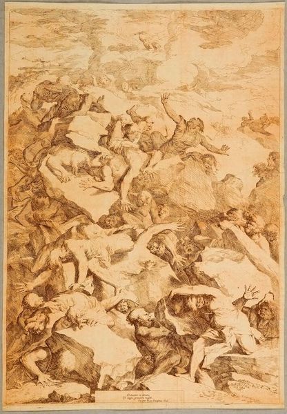 Editor: This is Michel François Dandré-Bardon’s "An Allegory Comparing Music and Poetry," created in 1740, using ink on paper. There's this swirling mass of figures, all rendered in reddish-brown ink, creating a rather dreamlike, ethereal composition. What compositional elements stand out to you? Curator: Immediately, the lack of stark value contrast is apparent; it softens forms within a unified visual plane. Dandré-Bardon utilized tonal gradations achieved through varied ink washes to sculpt forms. Note the deployment of linear perspective as a symbolic scaffolding in the background that recedes but ultimately lacks three-dimensional grounding. How does this absence affect the work? Editor: It makes it feel less about realism and more about...ideas. It's not a scene to be believed, but a concept illustrated, perhaps? It directs my reading toward interpreting symbolism in this context rather than a conventional representation. I suppose you might consider that intentional? Curator: Indeed. Observe how the dynamism in the line work suggests movement and energy. Consider the implications of semiotics within this space. Each symbol or form creates a network of meaning relative to the other through its spatial positioning. Note the organization; from chaos below, where an agitated and enthroned beast is pictured, forms arise that create, eventually reaching, equilibrium with an ascending Pegasus, suggesting a structured progression toward... Editor: ...harmony, perhaps? The symbolism then reinforces that reading: The beast chained becomes humanity refined by art? Curator: It's plausible, given the classical artistic lexicon employed, but we must always return to the formal elements—the relationships between line, tone, and the artist’s strategic utilization of space. That’s where our analyses and understandings become visible. Editor: That clarifies things. The linear development guides the viewer's journey. Curator: Precisely! It enables us to discuss the relationships and inner construction that shapes any work. We can consider any historical intention separately, but we read visual organization itself most immediately.