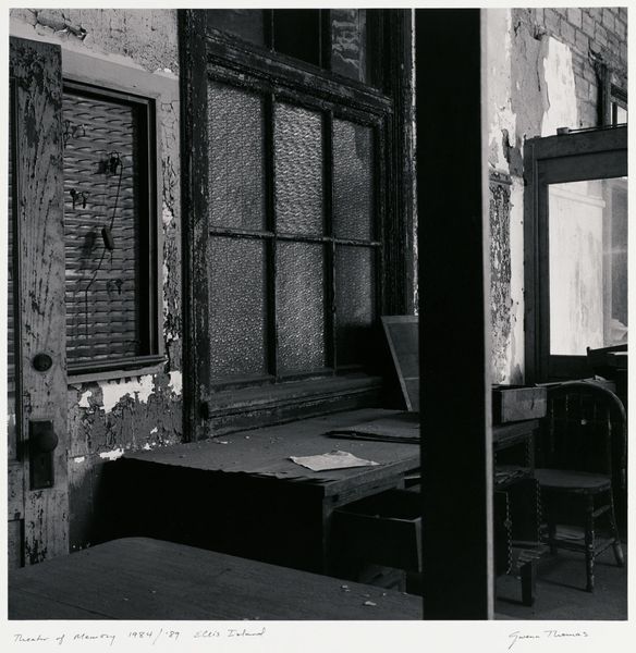 Editor: We're looking at "The Hollywood Suites (Windows) #21," a 1976 gelatin silver print by Steve Kahn. I'm immediately struck by the framed view – it’s like a stage, but the play is a mundane cityscape in monochrome. What story do you think Kahn is trying to tell? Curator: Well, my dear Editor, I think it's less about telling a specific story and more about inviting us to contemplate perception itself. Consider the window, both literally and figuratively. We are peering through a barrier, a constructed frame. What's included, what's excluded? It's a quiet nod to the artificiality inherent in how we choose to see the world, don’t you think? Plus, there’s a delicious tension between the stark reality and the subtle abstraction created by the monochrome tones. It's so still, isn’t it, like a forgotten photograph. Does it give you that sense too? Editor: Absolutely. The monochrome definitely adds to that feeling. I see how the window acts as both an aperture and a filter – dictating what we can observe. I am intrigued by the composition. Curator: And there’s something poignant about looking *out* of a window, isn't there? Especially from a place called the "Hollywood Suites." Are we looking at escape? Boredom? Is the dream factory just out of reach, framed like another black-and-white film? One can imagine the narratives… perhaps multiple? Editor: That's a lovely perspective, actually! I hadn’t considered that subtle commentary. Curator: And that, my friend, is what makes art endlessly fascinating – and such delightful conversation fodder. It's the whisper instead of the shout! Editor: Absolutely. It truly reshaped my appreciation for the piece, thank you!