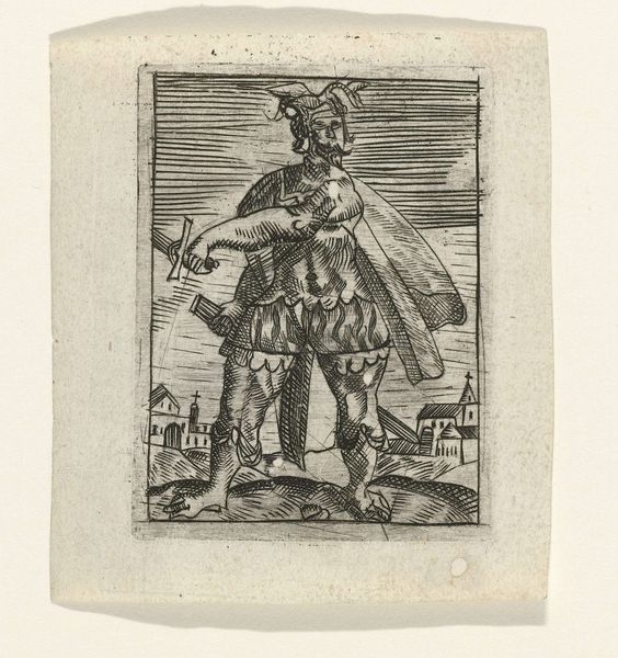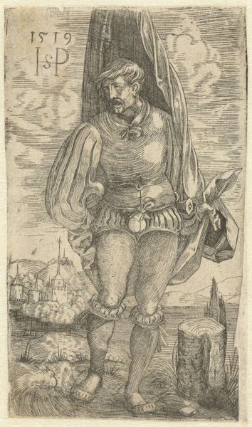 This is "Kleine vaandeldrager" by Albrecht Altdorfer, a small yet intricate engraving, capturing a Landsknecht standing over a landscape. The composition is vertically oriented, emphasizing the figure’s form. Altdorfer masterfully utilizes line work to define shapes and create tonal gradations, from the minute, spiraling curls of his hair to the folds in his sleeves. Notice the varied textures achieved through different etching techniques, giving depth and visual interest to this tiny world. The etching isn't just a portrait; it’s a study in contrasts and symbols. The Landsknecht, who's a german mercenary soldier, stands proudly, but the landscape behind him is more than a backdrop. It reflects the early 16th century's changing views on nature, in which landscape becomes a stage upon which meaning is created through the interaction between figure and setting. This is a complex interplay between the power of the individual and their place within a larger, often indifferent, world. It invites us to reflect on how we interpret meaning through both form and context.