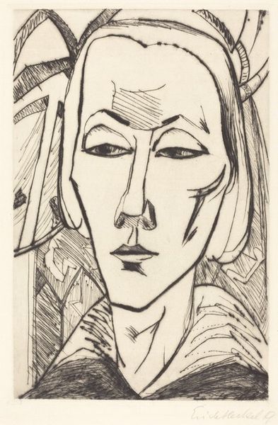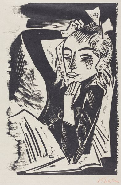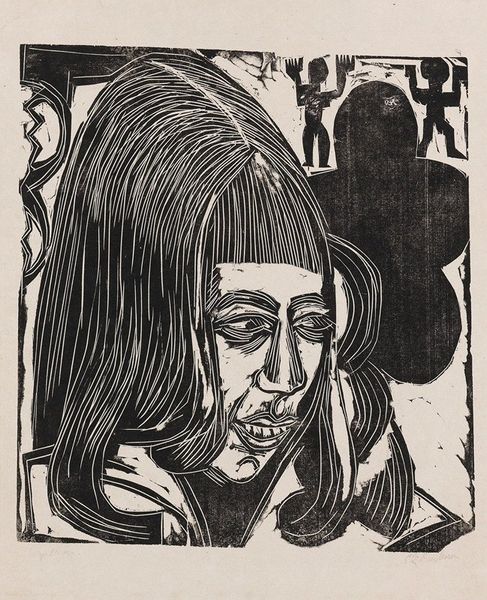 Curator: This is Werner Gothein’s striking woodcut portrait from 1919, titled "Rosi Fischer." Editor: It's…intense. Those eyes bore right through you. It feels both comical and deeply unsettling, like a dream where familiar faces become monstrous. Curator: Precisely. Gothein utilized the graphic nature of the print medium to really highlight specific features in a rather caricatured way. Notice the dramatic contrast of black and white. Woodcut printing in this period enabled artists to experiment rapidly and cheaply. Editor: It makes me wonder who Rosi Fischer was. Was she amused? Appalled? Did she recognise herself in this…angular visage? Curator: It certainly invites speculation! This artwork lives within the broader German Expressionist movement, which often prioritized emotional impact and the artist’s internal experience above purely mimetic representation. It represents the feeling rather than just appearance. The grotesque often finds beauty within the self. Editor: So, the harshness, the almost violent cutting into the wood block—it mirrors a certain emotional turbulence. Maybe Gothein isn't just depicting Rosi, but also reflecting the chaos of the time, right after the First World War? Curator: Exactly. We can't ignore the impact of socio-political upheaval on artistic production. There are other prints made in similar styles such as Käthe Kollwitz using art to explore emotion after the war. The availability of printing opened new modes of consumption and production within art. Editor: Thinking about that physicality, the labour...You can feel the artist grappling with something difficult through the medium itself. It goes beyond mere observation. I suppose, that resonates even a century later. Curator: Absolutely. And it compels us to engage, doesn't it? To think critically about the act of representation and the circumstances surrounding artistic creation. Editor: Well, I for one, won't be forgetting Rosi's gaze any time soon! Thanks, Gothein. For better or for worse.