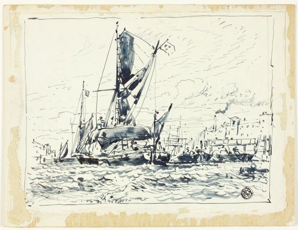 Curator: Welcome. Before us, we have "Cutting In," a 1919 etching by George Canning Wales. Editor: It evokes a sense of profound isolation, doesn’t it? The monochromatic palette and the sheer vastness of the ocean... it almost feels melancholic. Curator: Indeed. Note how Wales uses the etching technique to create fine, precise lines. The details in the rigging and the reflection on the water are particularly noteworthy, contributing to a strong sense of realism. Editor: Looking at this now, though, I’m thinking about global trade, about colonialism. These ships were conduits, carrying not just goods but also ideologies, power imbalances...it’s difficult to separate that history from such a majestic image. Curator: The composition definitely supports a discussion of such systems. The ship dominates the foreground, an almost sculptural form that commands the visual space. It speaks to its function, its implied mastery over nature. Editor: Yes, the ship is definitely foregrounded in the viewer’s space, a visual cue implying power. But I think too, that it’s worth acknowledging that the scene feels incomplete, even unsettling. Curator: Incomplete? Unsettling? In what sense? Editor: Where are they going? What are they doing? We're missing crucial elements. That void is itself an evocative absence suggesting how histories of commerce were written to systematically erase certain people, realities, and even ecologies. Curator: That’s a compelling reading, I must say. The absence then, amplifies a message. As a formalist, I still marvel at the intricate texture Wales achieved with the etching needle and acid, regardless of the specific context. Editor: Art always exists within a web of social relations; that, I think, is key to how it affects and reflects. Still, these renderings of merchant vessels—and their place within a broader sociohistorical perspective—undoubtedly warrant further reflection.
