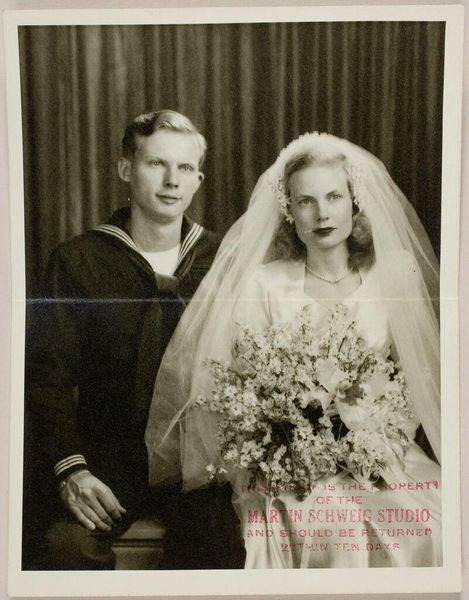 Curator: Here we have Martin Schweig's "Untitled (bride and groom, St. Louis, Missouri)" from the collection of the Harvard Art Museums. Editor: It’s a strikingly formal black and white photograph. The textures of the veil and sailor's uniform really stand out. Curator: Absolutely. And knowing it was taken in St. Louis, we can think about the socio-economic context of wartime weddings, especially for a sailor. What did marriage signify at that moment? Editor: Beyond the image, I wonder about the paper it's printed on, the chemicals used, the labor in its creation. These materials and processes are so central to understanding photography. Curator: Indeed, and it adds layers to the narrative beyond just a simple wedding portrait. It's a poignant reminder of the past. Editor: A past made tangible through very specific, and often overlooked, materials.
