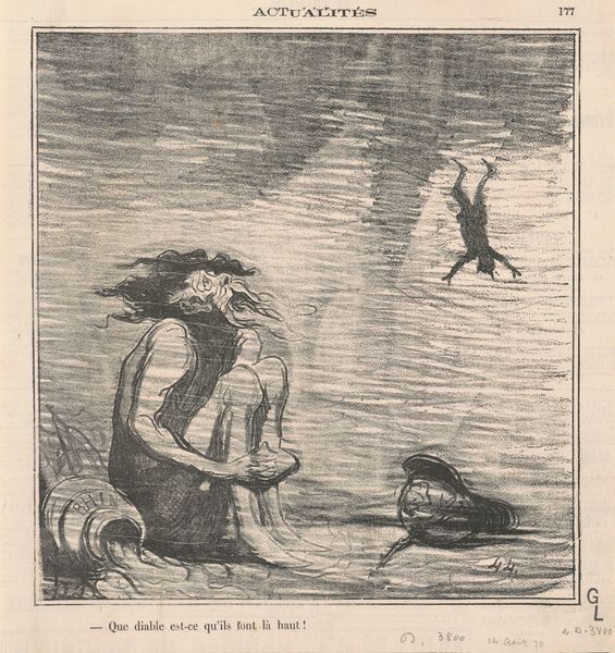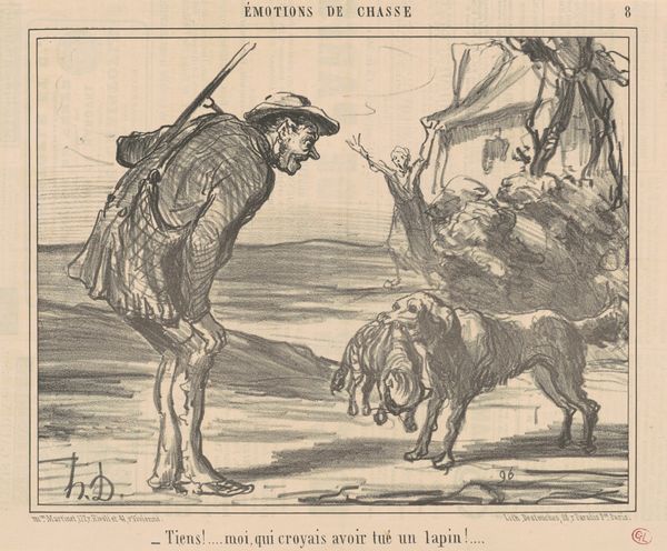 Curator: Here we have Honoré Daumier's "Bertrand et Raton," a lithograph from circa the 19th century. What are your initial impressions? Editor: Well, it certainly jumps out with a chaotic energy! The figures, dramatically rendered with loose, scratchy lines, look like they're in some kind of desperate chase or argument. It reminds me of a frenzied theatrical performance. Curator: Indeed! Daumier masterfully employs caricature to satirize the political climate of his time, often targeting those in positions of power. It’s worth examining how this work critiques societal structures through its exaggerated figures. Note how they're staged – it brings to mind political maneuvering and the inherent folly of ambition. Editor: Right, there's a clear class dynamic at play even just from their costumes. The man on the left is rough, almost peasant-like, versus the more deliberately absurd costume of the right figure, who holds what appears to be the object of their…emotions de chasse? Curator: Exactly! Daumier was a master of social commentary. Through his focus on the material conditions of 19th century France, you see this play between high and low culture. Think about the means of production behind lithography—a relatively accessible print medium that allowed for the wide dissemination of his critical perspectives, challenging the elites in power. Editor: So the mass production contributes to the democratizing force of this romantic vision. I’m intrigued by that juxtaposition of technique and the raw human emotions being depicted. It’s as if the industrial process itself is amplifying the drama. How was the response to this piece and others? Curator: Controversial, of course. Daumier frequently ran afoul of the censors, and even served time in prison for his satirical depictions of King Louis-Philippe. "Bertrand et Raton", with its underlying themes of manipulation and greed, was certainly interpreted as a scathing commentary on political figures of his era. These emotional caricatures exposed hidden class issues and their effects on material, political power, as much now as then. Editor: It all brings us back to considering the ways Daumier employed accessible materials, the lithographic stones, and techniques to push against constraints. This romantic piece invites discussion and analysis regarding labor, society, and consumption of the print itself. A provocative use of accessibility. Curator: Yes, considering "Bertrand et Raton," we see how it invites conversation around politics, societal structures and challenges us to really consider those in power. Editor: Absolutely, a good reminder that even simple tools and production can fuel major challenges against politics.