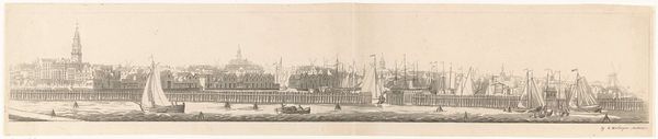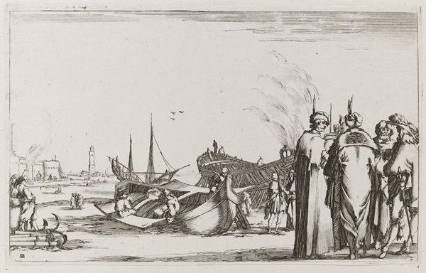 Curator: This is François Collignon’s etching, "Three Men Talking, center, as Boat Is Repaired in background," from the collection of the Harvard Art Museums. Editor: The tonal range and bustling scene grab me right away! It’s a hive of activity—though what exactly are they doing? Curator: Let’s consider the material processes. Collignon masterfully uses etching to depict labor. A boat is being repaired under a makeshift tent; the men are either building or maintaining infrastructure. Editor: True, but the three figures in the foreground stand out. Are they overseers, perhaps? Who benefits from this labor, and who is exploited? Their posture and dress suggests a certain status, set apart from the workers. Curator: Yes, the composition seems to highlight the social hierarchy inherent in maritime industries of the time, particularly ship building and associated trades. Editor: Thinking about today’s global supply chains, and who profits from the labor of underpaid workers, this image provides an important intersectional lens. Curator: Indeed, it prompts critical thinking about how material production is often intertwined with social inequalities. Editor: Precisely. I’ll be thinking about the image and the people in it for days.
