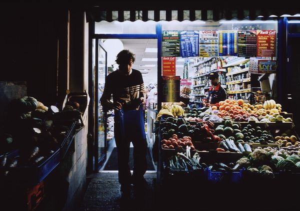 Curator: This is "East Village Diptych," a painting by Vincent Giarrano. Editor: My first impression is melancholy. The hunched figure and muted colors, despite the setting, create a sense of urban isolation. Curator: Absolutely. The diptych presents a split view, drawing the viewer into a very particular street-level perspective. The use of acrylic on canvas captures the grit and realism synonymous with street photography, don't you think? It begs the question, what commentary is being made? Editor: Definitely realism, but I read the perspective as subtly challenging assumptions around class and access. Who gets to occupy urban spaces, and how? The central figure, possibly homeless, contrasts against the restaurant setting. The artwork places contemporary issues regarding urban space, community and individual experience into an artistic arena. It suggests these problems aren't disconnected or distant. Curator: I'd also highlight Giarrano's choice to paint a diptych, underscoring the theme of duality. Consider the use of contrasting light and shadow, also—the way light illuminates the figure, against a dimly lit entrance. The diptych format allows us to look at two parallel realities simultaneously. What might that represent to viewers from different backgrounds? Editor: It speaks volumes about lived experiences depending on various factors such as socioeconomic status, access to resources, or societal standing. Furthermore, this contrast causes one to examine existing institutional structures—museums and galleries themselves included—for their role in curating access and creating social separations. Curator: And this points to the complex social politics within urban areas and asks fundamental questions of inequality, representation and individual vs collective struggles experienced within our society, particularly within marginalized communities or classes. Editor: Precisely, Giarrano prompts a broader critical reflection around how art addresses those power imbalances and contributes or challenges dominant ideologies within artistic representations. Curator: Thank you for unpacking those dynamics with me. It offers valuable insights into understanding how this piece connects our broader discussions about urban identity. Editor: A powerful, complex work. I walk away seeing so much that begs examination beyond surface interpretations.