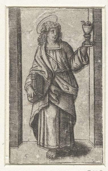 "Saint John, book in right hand chalice in left" is an engraving by Marcantonio Raimondi, created during the Italian Renaissance. Religious imagery during this period was a powerful tool for cultural and social formation. Raimondi's work reflects a time when the Church’s influence permeated every aspect of life. The figure of Saint John, holding a book and a chalice with a serpent, speaks to the intertwined themes of knowledge, faith, and overcoming evil. John’s androgynous representation challenges traditional gender norms, presenting a figure whose power transcends conventional masculinity. The choice to depict John with a serpent in his chalice also hints at deeper, more subversive narratives, a direct challenge to the status quo. As we contemplate this image, let’s consider how it reflects the complex, and sometimes conflicting, spiritual and social currents of its time. The emotional power of this work lies in its delicate balance between reverence and rebellion.