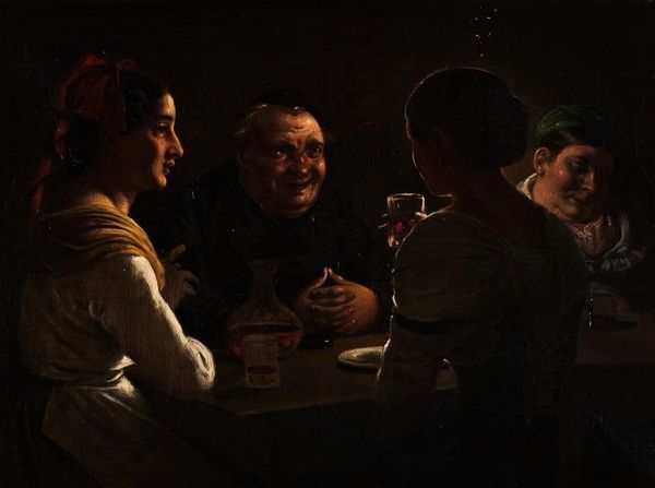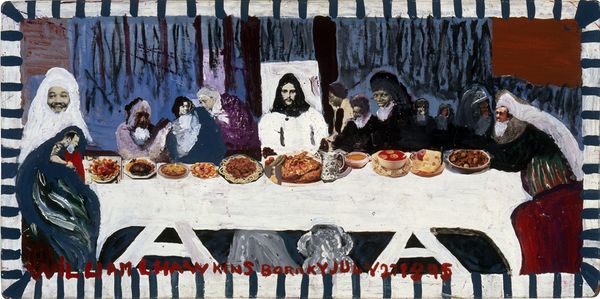Editor: Here we have Joshua Flint's "The Banquet," created in 2016, an intriguing blend of oil paint and gouache, evoking something that feels both familiar and unsettling. It reminds me of a dream... slightly out of focus, maybe a memory. What stands out to you when you look at it? Curator: Ah, a feast for the eyes and the mind, wouldn't you say? What intrigues me most is the juxtaposition – the casual gathering clashing with the ethereal, almost spectral backdrop. It’s like a scene from a play where the stage setting suddenly overwhelms the actors. I wonder, are we witnessing a moment frozen in time, or a commentary on how easily we are distracted from the beauty, or terror, surrounding us? Does it make you feel grounded or adrift? Editor: Adrift, definitely. The people feel...layered. And that backdrop does give off an interesting theatrical sense. But adrift why? Curator: Perhaps because the usual anchors – recognizable space, sharp realism – are loosened. Flint presents figures in the style of romanticism with touches of surrealism in which figures share space with oil paint backdrops like painted scrims. Maybe the feast itself becomes a metaphor. What are they consuming, and what are they oblivious to? That strange beam of light reminds me of Caspar David Friedrich— the quiet awe that nature inspires when we bother to look up. Editor: I see that now – the light does add a certain drama. And the empty plates do prompt some interesting thoughts about consumption and distraction... Thank you! It is almost dreamlike; I wonder what the next course will bring? Curator: Precisely! And perhaps, more importantly, who will be present to truly savor it? That feeling of being “adrift” might just be Flint's clever way of inviting us to find our own bearings in a world overflowing with sights and sounds. I'll certainly be thinking of that!