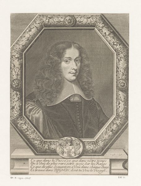 Curator: This engraving, now residing in the Rijksmuseum collection, is entitled "Portret van Burkhard Gotthelf Struve." It's estimated to have been created sometime between 1681 and 1725 by Christoph Weigel. The detail is extraordinary, especially considering its medium. Editor: The overall symmetry of the oval frame is quite appealing. I also can't help but notice the dramatic contrast between the stark white scarf and the dark robes, which immediately directs the eye towards his face. There's something almost theatrical about the composition. Curator: Absolutely. Weigel, the artist, was known for his meticulous approach. Considering this work’s Baroque style and the materials at hand – paper, graphite, and engraving tools – he certainly seems intent on portraying not only the man, but also his societal position through symbolic costuming and structured lettering. Do you think the printmaking process allowed for wider distribution, potentially influencing Struve's image and authority at the time? Editor: Possibly, yes, but how does this relate to Weigel’s deliberate play with light and shadow to shape the face and give it form? The sharp, clean lines used for this Baroque-era drawing creates a certain drama, reflecting perhaps not only literal accuracy but also how portraits shape an individual’s legacy through stylistic rendering, creating a long-lasting aesthetic form that echoes conventions, you know? Curator: Certainly, portraits held immense power, and they acted as significant visual markers for class and social role at a moment where production of portraits started becoming more easily accessible for certain bourgeois circles, especially if someone like Burkhard Gotthelf Struve was seeking to expand awareness of their professorship or bibliographic pursuits! Editor: Well put. It’s really quite fascinating how something produced through these processes, graphite on paper etched by engraving techniques, transforms into an image laden with meaning beyond mere likeness. Curator: It's that intersection of technique and social use that interests me the most; the mechanics used, the materiality of ink on paper contributing not just an artwork, but something ingrained and active within a network. Editor: Yes, a powerful thought, a truly intricate and captivating demonstration, all formed simply of clean visual expression.