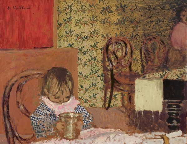 Curator: Upon first seeing this, I'm struck by its muted intimacy; it's as if the artist has captured a stolen moment. Editor: Indeed, this oil painting, “Woman Sitting by the Fireside,” was completed circa 1894 by Édouard Vuillard. The painting really epitomizes his intimist style, where he turned his attention to the domestic sphere, particularly women. I wonder, does the fire have symbolic meaning, perhaps warmth, protection, the heart of the home? Curator: I think you are on to something. Visually, it’s a dark mass that nearly overwhelms the picture, however the suggestion of safety within a middle class life could definitely be inferred from such prominent hearth. But consider also what's not there – who isn't visible, who isn't acknowledged. The absence of overt emotional expression makes the interior psychological landscape perhaps more compelling, less prescribed. Editor: That’s a sharp reading, viewing the figure as embodying or facing internalized forces rather than outward engagement. I’m also intrigued by Vuillard’s deliberate blurring of boundaries between the figure and the environment. Is the wallpaper, perhaps, an expression of domestic containment? Curator: Precisely! We can read it as a manifestation of societal expectations pressing in. Yet, the way the pattern nearly dissolves her form, creates a fascinating visual ambiguity around identity, social expectations, class status… It could also represent the blurring lines between the private and the public spheres. I’m particularly drawn to the way the checked pattern of her clothing almost camouflages her. It’s less a declaration, more an embodiment of interior thought. Editor: Absolutely, a visual reflection of lived experience – a very important concept in feminist discourse! For me the subdued color palette evokes both comfort and quietude. Curator: And maybe a resignation of sorts... Editor: I think the longer we look, the richer this unassuming painting becomes. Curator: Agreed. Vuillard encourages us to really reflect on what "intimacy" signifies and to analyze power relations with care and curiosity.