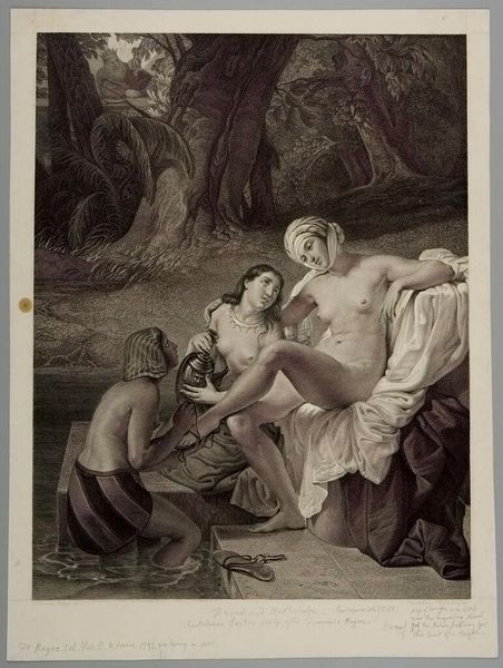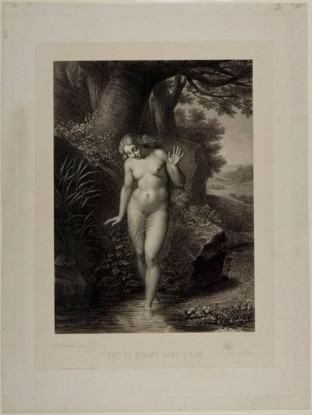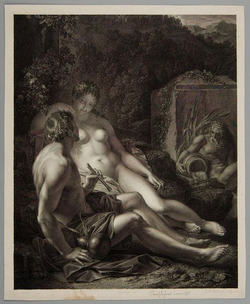 Curator: This is "The Pardon of Adam," an engraving by Pierre Pelée, held here at the Harvard Art Museums. Editor: It's striking. Adam and Eve are positioned in a garden landscape—I'm immediately struck by their almost pleading postures. It evokes vulnerability. Curator: Engravings like this were often reproduced for mass consumption. Think about the socio-economic implications—how readily available were these images to the working classes? Editor: Right, and it invites questions about the dominant narrative of the fall. Is this forgiveness a restoration of patriarchal power, or something more subversive? Eve's posture is so interesting here, how it subverts conventional images of beauty and innocence. Curator: Exactly. The labor involved in creating an engraving allows these images to proliferate, but often without consideration of the original artists’ intent, or the historical context that shaped it. Editor: I find myself dwelling on the power dynamics at play, seeing the original sin as a struggle against imposed order. Curator: So much here for us to think about in terms of visual communication, consumption, and even transgression. Editor: Definitely gives us a lot to consider, beyond the initial interpretation.
