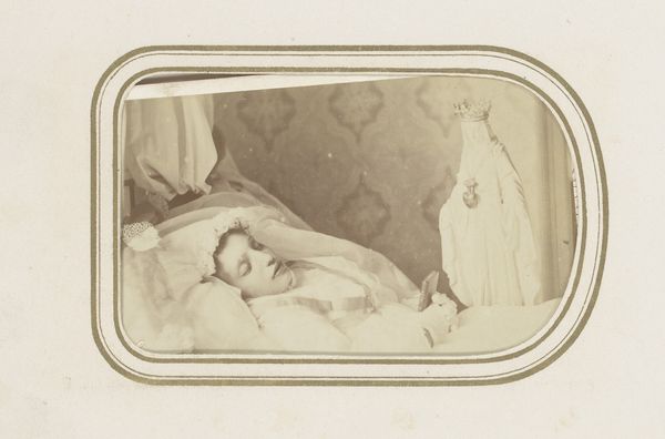 Editor: So, this is a post-mortem portrait of an unknown man, likely taken sometime between 1863 and 1884. It's an albumen print photograph. There's a stillness to it that’s quite unsettling. What do you make of this photograph? Curator: It’s a chilling example of a once relatively common practice, reflecting societal attitudes toward death and mourning during the Victorian era. What we now consider macabre was then a way to preserve the memory of the deceased, especially of children, who sadly had lower life expectancy. Editor: A way to preserve memory... I hadn’t thought about it that way. It feels almost voyeuristic to us now. Curator: Indeed. But consider the context: photography was still relatively new. These post-mortem photographs provided a tangible "last look" during a time before snapshots were ubiquitous. They played a vital role in the rituals surrounding death. These images weren't necessarily viewed publicly in the same way we consume images today, so should that effect how we perceive it as a "public" work? Editor: That's fascinating. So, you're saying it was more about private remembrance than public display, which really shifts my understanding. Curator: Exactly. And the “realism” that photography offered was believed to provide a truer representation than a painted portrait. So how does that truthfulness effect the modern perception of the sitter, as compared to a romanticized or fictional one? Editor: I hadn't considered the impact of realism either. It makes you wonder about the social class implications – who could afford such a memorial? Curator: Precisely. The economics and accessibility of photography played a significant role in who was remembered in this way. It's another layer of the story this photograph tells. Editor: This has given me a new perspective on post-mortem photography; I will now reconsider this work with fresh eyes. Curator: It illustrates how deeply art is embedded in social practices and economic realities; things often shift beyond just aesthetics.