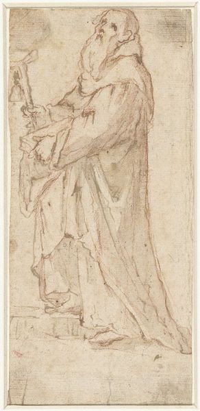 Editor: Here we have Cigoli's "Lopende jongeling met wijde mantel," created sometime between 1570 and 1613. It's a pencil drawing on paper, a quick sketch really. The figure seems caught mid-stride, almost ephemeral. It reminds me of a fleeting thought, barely captured. What stands out to you most about this piece? Curator: Fleeting is a beautiful way to describe it! What I find striking is the inherent vulnerability in the sketch, like witnessing a private moment in the artist's creative process. Look at the economy of line, how little is needed to convey form, weight, and movement. You sense Cigoli wrestling with the pose, searching for the perfect angle. Does it feel unfinished, or simply... honest? Editor: I think honest is spot-on. There's no attempt to idealize, just the raw energy of observation. But who do you think this "jongeling" is? Curator: Ah, that's the delicious ambiguity! It could be a preparatory study for a larger composition, or a figure drawn simply for the pleasure of observation. Perhaps it's Cigoli himself, caught in a moment of introspection. Look at the way the mantle drapes; the artist is clearly fascinated by its fall and texture. Editor: That’s interesting; the fabric does have a tangible weight despite being just a sketch. Thinking about the Renaissance context, would sketches like these be common practice? Curator: Absolutely. The Renaissance was a period of intense study and rediscovery. Artists like Cigoli would fill sketchbooks with observations from life, anatomical studies, drapery studies – all fueling their grander works. This "jongeling," though seemingly minor, embodies the spirit of artistic inquiry. Editor: It’s almost like a peek into the artist’s mind. Thanks, I really see it differently now. Curator: The pleasure was all mine! Every sketch, every stroke holds a whisper of the past, and offers its own intimate reflection.