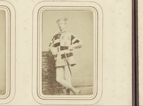 This portrait of a young man in costume was made by Henri Pronk in the Netherlands, using early photographic methods. The image presents us with a peculiar set of social codes. The young man’s theatrical costume, complete with sword, suggests a staged performance or tableau vivant. In the 19th century, such displays were popular forms of entertainment among the upper classes, often referencing historical or literary themes. The inclusion of a classical column fragment indicates a cultivated, educated subject, familiar with art history and performance culture. Consider the social conditions that made such a portrait possible. Photography was still a relatively new technology, and portraiture was a status symbol. The subject's carefully constructed image reflects the values and aspirations of a specific social class, one that had the leisure and means to engage in artistic pursuits. To understand this photograph fully, we might research the history of theatrical performance in the Netherlands, the rise of photography as a social practice, and the socio-economic context of the sitter. Art gains its full meaning when we connect it to the social and institutional conditions of its making.