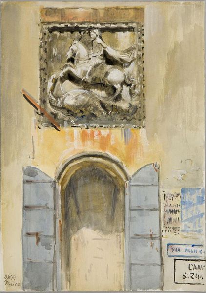 Editor: So, here we have Childe Hassam's "Gate of The Alhambra" from 1883, seemingly rendered in watercolor. I'm really struck by the contrast between the detailed stonework of the gate and the sort of ethereal quality of the figures passing through. How do you interpret this work? Curator: Notice first how Hassam utilizes light. The upper portion of the gate is bathed in sunlight, achieved through layering delicate washes. Observe the shadows, particularly the graduated shading that gives volume to the arch. These are structural components used to create a convincing rendition of light on form. Editor: Yes, I see the interplay of light and shadow giving it form, but it almost feels dreamlike too. Is that just a result of the impressionist style, or something more intentional? Curator: Let's focus on Hassam's composition. The gate acts as a frame within a frame. Note how the artist positions the architectural elements. Is it symmetrical? Or are there subtle distortions that lead your eye? Look at how the space inside the gate is handled, almost flattened, juxtaposed against the tactile surfaces of the architecture. These elements create tension, influencing our understanding of depth and perspective. Editor: That's a good point. The gate *is* a frame. The detail is fascinating up close, but then when you pull back it feels almost abstract, which gives it this…looseness. Is there a formal term for that juxtaposition? Curator: We might refer to it as a "dynamic tension" between representational detail and an almost abstracted treatment of space. Also observe the colour palette and how it contributes. Are the colours harmonious or clashing? How does this serve the artwork's mood and sense of structure? Editor: The more I observe the composition and color values, the more the initial sketch quality starts to become balanced, offering complexity and a real perspective. Thank you for pointing out those structural aspects of Hassam's "Gate of The Alhambra," looking closer allowed for greater insight into the artwork’s depth. Curator: Indeed, by examining Hassam’s use of line, form, color, and composition, we are better equipped to understand how "Gate of the Alhambra" achieves its visual impact.