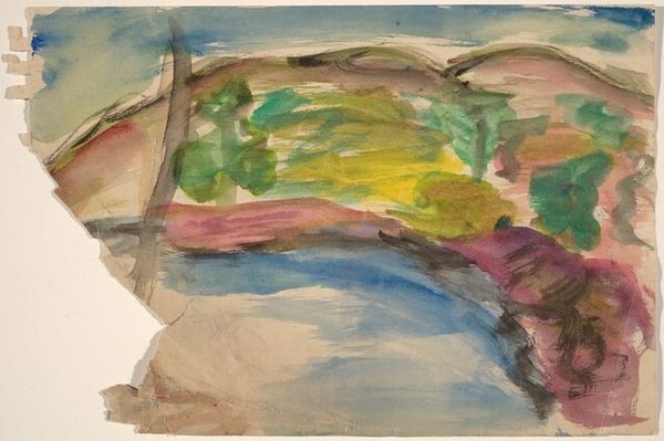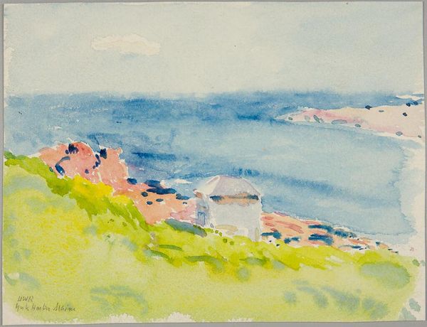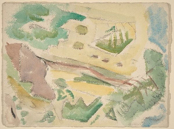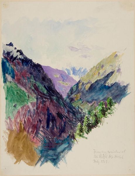 Editor: This watercolor is called "Huts on the Side of a Mountain, Serravalle, Italy," by Denman Waldo Ross. I’m really drawn to the way the washes of color create a dreamlike, almost hazy effect. What story does this painting tell, in your opinion? Curator: It's fascinating how Ross uses watercolor to depict not just a scene, but also a feeling. How do you think the choice of such a light medium, watercolor, affects our perception of the Italian landscape being represented? Editor: It definitely makes it feel less permanent, more like a fleeting moment, something captured in time. Curator: Exactly! And consider the historical context. Travel was becoming increasingly accessible. Could this be interpreted as a picturesque souvenir, reflecting the romanticism associated with the Grand Tour, but made more accessible to a burgeoning middle class? Editor: I hadn't considered it that way. It makes you wonder about the politics of whose landscape gets represented and how. Curator: Precisely. We’re not just seeing a mountain; we're seeing a carefully constructed image for a particular audience. Editor: I’ll definitely look at landscape paintings differently now.