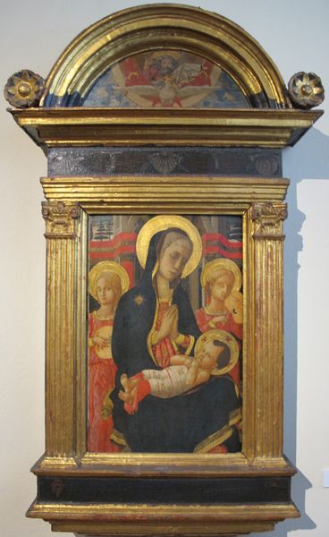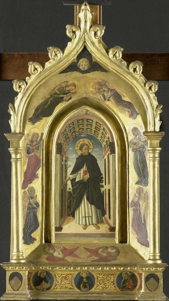 Editor: This is “Sacra Di San Michele,” a tempera on panel attributed to Defendente Ferrari. Looking at the composition, I’m struck by the artist’s arrangement of these figures and how the gilded detailing emphasizes the iconographic significance. What do you see in this piece, beyond its religious narrative? Curator: The meticulous execution and arrangement invite a close reading of its visual elements. Notice how Ferrari employs symmetry. The central panel, depicting the Madonna and Child, is flanked by two panels populated with figures, contained within the frames of what we might describe as fictive architecture. The frames contribute an essential order to the painted space. Do you see how line and form create balance, grounding the ostensibly sacred content in formal harmony? Editor: Yes, the gold leaf certainly enhances the flatness of the picture plane and calls attention to the constructed nature of the image, despite the figures. Is the artist making a comment on earthly power by framing it so elaborately? Curator: Perhaps indirectly. However, let us consider the work’s formal elements foremost. The artist manipulates line, color, and form to establish the architectural structure first; any commentary is necessarily rooted in that formal construct. Consider the Madonna's elongated form. It serves to elongate the central space and reinforce a visual harmony that precedes—and potentially supersedes—any narrative interpretation. The architectural frame both contains and exalts. The contained narratives become just another level in the reading. Editor: So, even if there is a meaning encoded, the artist's conscious manipulation of the pictorial space directs our attention, rather, to the techniques that produce that meaning. Curator: Precisely. And the enduring fascination with this work lies in its ability to continually yield new readings through careful attention to its inherent structural logic. Editor: Thank you! It’s fascinating to consider how the construction of an image can be just as meaningful as its ostensible subject matter.