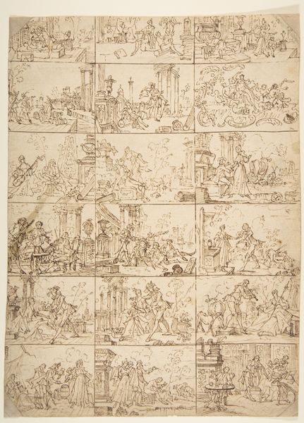 Curator: This densely populated print, dating from 1603, is titled "Triumph of a Roman Emperor (left side)," created by Antonio Tempesta. Editor: Whoa. My first thought? Organized chaos. It’s like a historical comic strip crammed onto one page, a visual feast with layers upon layers of tiny, intensely active figures. What am I even looking at? Curator: Exactly! It presents a multi-layered narrative, showcasing various stages of a Roman Emperor's triumphant return. This engraving pulls heavily from the visual language of ancient Roman art, reinterpreting imperial power for a contemporary audience. Editor: So, it’s like propaganda, but make it art? I’m seeing processions, crowds, what looks like religious ceremony up top. What strikes me, besides the pure density, is the horses. They add a sense of motion, of forward drive in all those individual stories. Curator: The prominence of horses is certainly not accidental. Equestrian imagery has been inextricably linked with power and authority throughout Western history. In this context, it echoes earlier representations of Roman military might, contributing to the overarching theme of imperial dominance. We also can't overlook the socio-political context in which Tempesta was working. Consider the rising power of various European monarchies in the 17th Century. Editor: Right, and art becomes a tool to reinforce legitimacy. I see that. Looking at it from a different angle, though, do you think Tempesta was overwhelmed trying to fit all these details? There's a slightly frenetic quality that almost undermines the grand statement. Curator: I find that tension quite compelling! The artist had to balance precision and comprehensiveness, while working with the limitations inherent in engraving. He captures a feeling that is at once celebratory and chaotic. How do we reconcile such a monument to power, when its construction appears so fraught? Editor: It feels relevant to now. Monuments are so loaded; they ask to be reinterpreted, re-evaluated, vandalized sometimes, or even torn down! Curator: A piece like this makes visible the relationship between artistic representation, power, and historical memory. By engaging with the work’s context, its purpose, its artistry, we gain a more complete understanding. Editor: For me, getting lost in the detail is the magic. It feels both epic and intimate, inviting a really personal kind of looking, despite the huge scale of the "Triumph" it depicts.