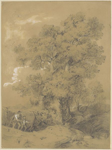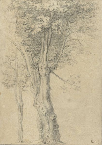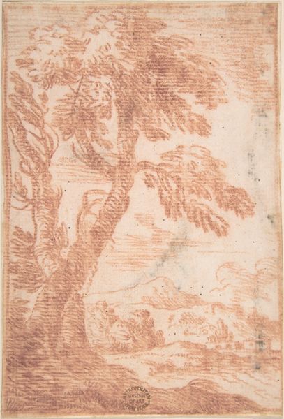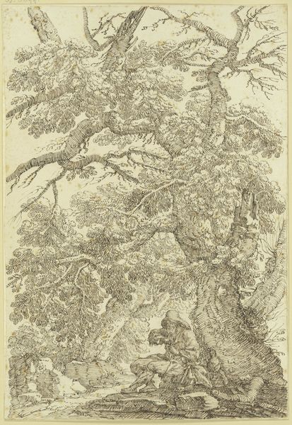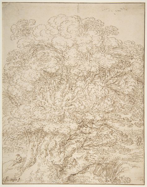 Curator: What an extraordinary drawing. Its gnarly texture makes me think of an etching rather than just a humble sketch. Editor: Definitely looks like an old soul. It’s the kind of tree I’d happily spend an afternoon reading under, despite all those suspiciously twisty branches! Curator: It's indeed evocative. This drawing is attributed to Salvator Rosa, and we know it as, simply, "A Large Tree". Rosa made it sometime between 1615 and 1673, in ink on paper. He lived and worked in Italy at this time. Rosa had a fascinating career – soldier, poet, actor, printmaker and of course, a painter and draughtsman. Editor: Jack of all trades, master of nature? This has got all the hallmarks of those baroque landscapes where you’d wander in nature and meet hermits or discover overgrown ruins in hidden corners. Did he actually rough it in the woods like a 17th-century Bear Grylls to produce this? Curator: He cultivated a rather rebellious persona; a sort of “artistic bandit” figure and he’s celebrated for these rugged landscapes but scholars think that actually he worked on his studies in his studio not outdoors in the wild! His images were more the product of invention and theater. He understood how to work the art market, essentially crafting his own image. Editor: Well that’s a shame, but figures! It is interesting though, because I do feel a tension here. There’s all that chaotic Baroque drama… but then he's also making close observations. Those individual leaves seem so tenderly observed, he gets at that beautiful branching structure. Curator: Yes. Rosa helped shape an emerging taste for a wilder aesthetic in art and landscaping. It helped, certainly, that in England his images were collected by folks involved in radical politics, like the republicans and Whigs, as it boosted that 'rebellious' angle, but even royalty like Charles I liked and bought his work. He hit this perfect storm, really. Editor: It all comes back to the market, right? Even "artistic bandits" need patrons. Still, it's fascinating how a simple tree study can be tangled up in such a web of meanings – nature, rebellion, artifice. Food for thought! Curator: Indeed, thinking about what appears as an authentic representation and how constructed and cultivated these images can be.