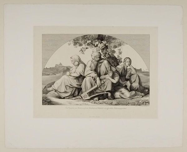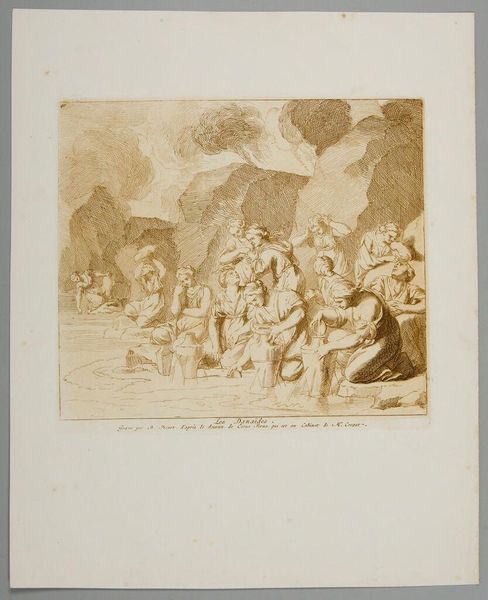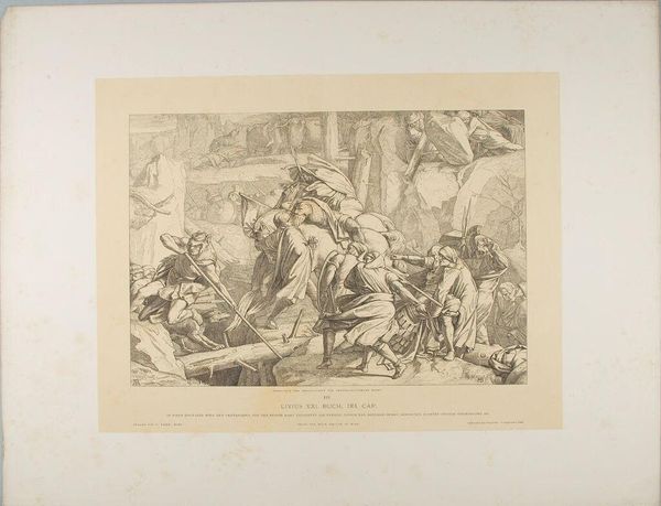 Curator: Alfred Rethel, a 19th-century German artist, created this image, titled "The Carthaginian March over the Alps," as part of a portfolio on Hannibal. Editor: It’s bleak. The stark contrast emphasizes the harsh, unforgiving landscape. The figures are rendered with such sharp detail. Curator: Rethel's work often reflects the political and social anxieties of his time. Hannibal's crossing serves as a historical parallel, perhaps commenting on contemporary struggles for power and the cost of ambition. Editor: The composition, though, leads the eye directly through the frame and into the distant mountain, where there is an opening. The way the light hits the stone. It's all in the details. Curator: Right, and consider the cultural context: 19th-century nationalism, the romanticization of historical figures… Hannibal becomes a symbol. Editor: The figures are caught between the solidity of the mountain and the light in the distance. A sort of in-between space. Curator: Exactly. Rethel certainly invites a deeper look into how history shapes present identities. Editor: It's rewarding to analyze the interplay between form and content.