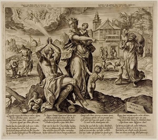Editor: Here we have "The Way of the Devil" from the Workshop of Philips Galle. It's hard to put a date on it. Looking at the scene, I'm struck by its theatricality, almost like a dark stage play. What do you see in this piece? Curator: Oh, it's a glorious little morality play, isn't it? The devil enthroned, flanked by the temptations of earthly delights on one side and the promise of ruin on the other, while mankind kneels in supplication. It's a potent image of choice, isn't it? Do we succumb, or do we resist? Editor: I hadn't thought about it as a moment of decision. Curator: Exactly! And perhaps, ultimately, the devil isn't some external force, but the reflection of our own desires. Editor: That adds a whole other layer. I will never see this image the same way again.