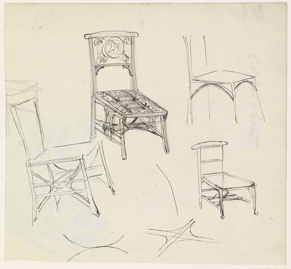 Editor: This is "Stoelen en ornamenten," a pencil drawing from around 1850 by Pierre Joseph Hubert Cuypers, found in the Rijksmuseum. It strikes me as a really raw, immediate look into the design process, like peering into the artist's sketchbook. What formal elements stand out to you in this work? Curator: The emphasis on line and form is immediately apparent. Notice how Cuypers uses delicate, almost tentative pencil strokes to delineate the various shapes and ornamental details. It's less about creating a realistic depiction and more about exploring the possibilities of design through repetition and variation. How do you see the distribution of positive and negative space affecting the overall composition? Editor: I think the empty space is as important as the lines themselves, almost like a visual breathing room that lets the eye travel across the page. It prevents the drawing from feeling cluttered despite the density of the sketches. Curator: Precisely. This interplay between positive and negative space enhances the perception of depth and volume, even within the limitations of a pencil sketch. Consider the linear perspective. Cuypers doesn't adhere to strict, scientific perspective, but instead uses a more intuitive approach to suggest three-dimensionality. It's through these formal choices that we begin to understand his aesthetic concerns. Does the repetition of forms indicate intention to you? Editor: Absolutely. It shows him working through different versions of the same idea, refining the details and proportions each time. There’s a clear evolution of form visible across the page. Curator: Indeed, each variation functions as a study in itself, revealing a systematic investigation of shapes and structures. The absence of color further accentuates the underlying framework. What new appreciation for the role of sketches has been kindled? Editor: This has totally changed my perspective; sketches as finished artworks and the story told about the mind of an artist. Thank you! Curator: You're welcome, recognizing these foundations provides valuable insight into their conceptual development.