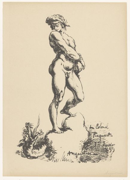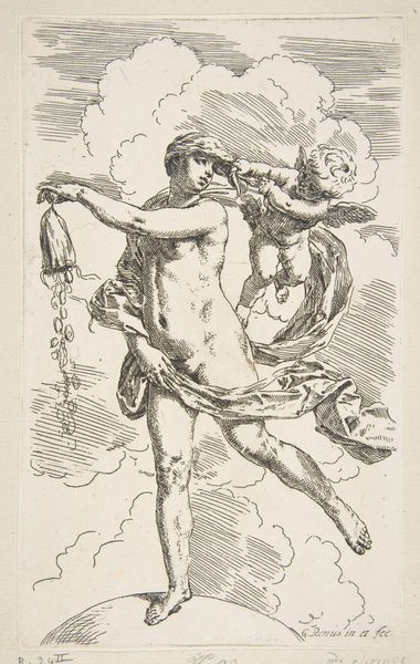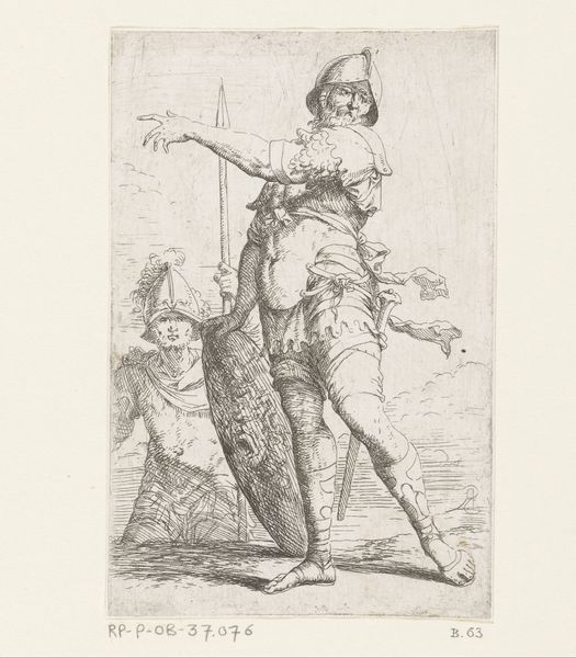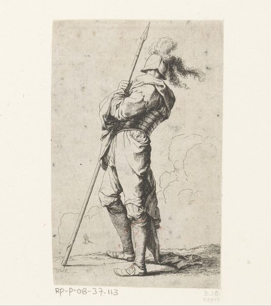Salvator Rosa's etching, "Soldier with a Staff," presents us with a figure rendered through a dynamic interplay of line and shadow. The composition, though simple, pulses with vitality due to Rosa's skillful manipulation of the etching needle. Notice how the figure dominates the frame, its contours defined by stark, confident lines that give shape to the soldier's body, clothing, and staff. The contrasting areas of light and dark, achieved through dense cross-hatching, not only model the form but also contribute to a dramatic tension. The soldier's gaze, coupled with his pointing gesture, creates an implied line that propels our eyes beyond the confines of the print, inviting us to consider what lies beyond. Rosa, working in the 17th century, operated within a cultural milieu steeped in classical and baroque aesthetics. The figure's somewhat theatrical pose and attire hints at an engagement with the conventions of the stage, where dramatic narratives of heroism and conflict were played out. The etching is a testament to the power of linear expression.