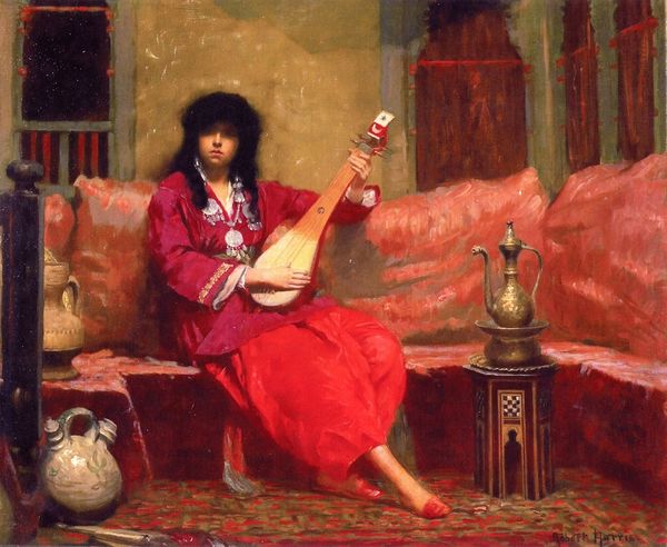 Curator: Let's discuss this intriguing painting, often titled "The Musician," by Ernest Meissonier. It's an oil on canvas work, offering a glimpse into a bygone era. Editor: Oh, instantly I get this feeling of quiet intensity! He’s totally lost in the music, right? The light catches his hair just so...it feels very personal, very…intimate almost. Like we're eavesdropping on a private moment. Curator: Precisely. Consider the artist’s commitment to detail. Meissonier was renowned for his almost photographic accuracy, particularly in his genre scenes and historical depictions. Note how the artist uses the layering of space and form to articulate the narrative content and generate meaning. Editor: It's the textures, though! You can almost feel the velvet of that tabletop cloth, the sheen on that silver jug...and the soft bend of that guitar as his finger traces a delicate and almost silent chord in this space. It almost breathes… you feel like any minute he’s gonna break into song and look straight at you, the interloper! Curator: The subdued color palette contributes significantly to the painting’s ambiance. We see masterful manipulation of light and shadow, which aligns with established academic art principles. Editor: Right. You know what? Maybe it *is* that stillness that makes it so appealing! There’s movement in the way his fingers look like they caress that thing but his face… total peace. It feels as deep as a sigh of sweet satisfaction! You can just taste it. Curator: Yes, the visual harmony underscores a structured composition. There's also a sophisticated awareness of the canvas in this academic example that bears analysis under a rigorous critical eye to gauge value as an exercise of high art form. Editor: It invites you into his world... but in a very respectful way. It doesn't demand your attention, it *earns* it through his gaze and gesture and through a moment captured, it simply *offers* to enchant. Curator: Absolutely. Through its composition and careful rendering of detail, it offers a complex and thoughtful vision to those with the patience to analyze its artistic choices. Editor: And I will gladly be drawn in. It just glows with life, you know? The piece resonates even without understanding the whole intent—like an enchanting spell made visual!