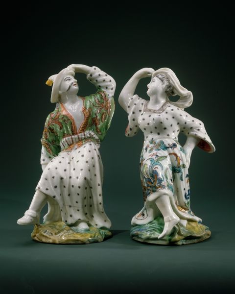 Curator: The whimsical sculpture before us is titled "Harlequin," crafted between 1755 and 1765 by the Nymphenburg Porcelain Manufactory. It resides here at the Metropolitan Museum of Art. Editor: What immediately strikes me is the material; porcelain gives it such a delicate, almost ethereal quality. The rhomboid patterns on the figures’ clothing create an engaging interplay of colour and shape that practically dances before your eyes. Curator: The "Harlequin" embodies the Rococo love for theatre, ornamentation, and the commedia dell'arte. We must consider how the Bavarian court embraced such characters as symbols of wit and social commentary. Editor: Yes, and how that visual language translates so effectively, particularly the contrasted diamond patterns. Visually, it emphasizes the movement and energy of the figure, an aesthetic interpretation of the performer’s liveliness. I appreciate its clean yet effective design language. Curator: Precisely. The sculptures were part of a larger suite of figures intended for aristocratic display, celebrating both social status and refinement of artistic taste. Imagine the figures aligned on a nobleman's table! The consumption of art as a social practice. Editor: I can envision them arranged precisely so, perhaps reflected in a mirrored surface to amplify the display. One is a traditional rendition of Harlequin, while the other presents in almost an inversed position. It makes me think if we were to rotate and recontextualize this design language, it would serve the piece almost as well, suggesting that even in rearrangement there is cohesion. Curator: These objects provided their owners platforms for signaling sophistication, subtly wielding soft power through consumption, and even social critique under the guise of playful entertainment. This porcelain Harlequin provides invaluable insight. Editor: From a purely aesthetic standpoint, "Harlequin’s" dynamism resides within its material’s surface, which makes me contemplate on surface, ornament and composition. It’s fascinating how these details play into the dialogue with movement and meaning in decorative Rococo art.