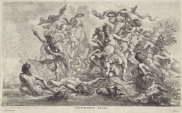 Curator: Ah, "Water" by Louis Desplaces. It's awash with drama, wouldn't you say? The figures are so buoyant, almost theatrical. I'm curious, what strikes you first about it? Editor: The sheer scale of it, I think, and the dynamic composition. It feels like a scene from a grand opera, with Neptune and what I assume is Amphitrite holding court amid the waves. All those cherubs and tritons! What do you make of the overall effect? Curator: It’s a celebration of water's power, no? But also, perhaps, its capriciousness. Desplaces seems to be playing with the idea of nature’s bounty, but also its potential for chaos. See how the figures are both supported and seemingly tossed about by the waves? Editor: That tension is definitely there. So, it's not just a straightforward glorification. Curator: Exactly! It’s a reminder that even the most beautiful forces can be unpredictable, even dangerous. Editor: I'll definitely look at it differently now. Thanks! Curator: My pleasure! Art is always a mirror reflecting our own watery depths, is it not?