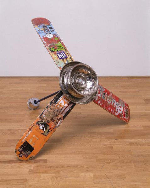 Curator: Here we have Alexandre da Cunha's work, "Erik Ellington (fan)." It's part of the Tate collection, and it really makes you think about the appropriation of everyday objects. Editor: Immediately, I see the repurposing of these well-worn skateboard decks – they give off such a raw, youthful energy. The metal elements add an interesting industrial contrast, don't you think? Curator: Absolutely. The fan, of course, is an object designed to provide comfort, while skateboards represent movement, rebellion, and perhaps a bit of danger. It plays into the social history of skateboarding. Editor: For me, it's about the act of making. Da Cunha highlights the inherent beauty and unexpected combinations we can create by re-examining materials otherwise deemed obsolete. Curator: And the title itself, "Erik Ellington (fan)," suggests a tribute to a skater, elevating street culture into a gallery setting and creating a dialogue between different social spheres. Editor: It reminds me that art can be discovered anywhere, in any form. The piece is really a clever comment on consumerism and the endless potential for repurposing the objects around us. Curator: I agree; it seems Da Cunha asks us to look beyond the typical roles assigned to objects and appreciate their inherent potential. Editor: A good reminder to stay curious about the possibilities embedded in the ordinary.