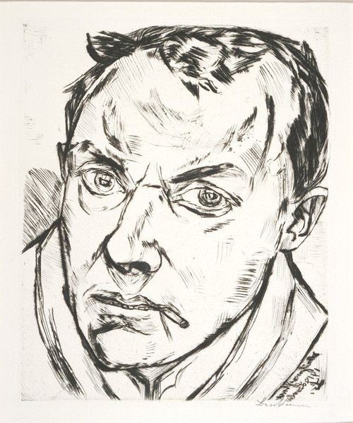 Curator: This is Lovis Corinth's lithograph, "Gerhart Hauptmann," a portrait of the Nobel Prize-winning German dramatist. It resides here at the Harvard Art Museums. Editor: He looks severe, almost burdened. The swirling charcoal around his head makes him seem trapped, or perhaps haunted by his own thoughts. Curator: It was rendered in 1917, a period of immense upheaval. Corinth, known for his expressive style, likely captured Hauptmann's own anxieties during World War I. Observe how light and shadow play on his face, revealing conflicting emotions. Editor: Absolutely. There is a tension there between his achievements and the turmoil of his time. One wonders about the artist's intentions portraying him this way. Was it a commentary on the artist's own anxieties during the war? Curator: It's fascinating how artists can distill the essence of a person and their era into a single image, isn’t it? Editor: Indeed. The lithograph becomes a mirror reflecting both the subject and the world around him.