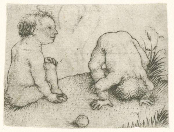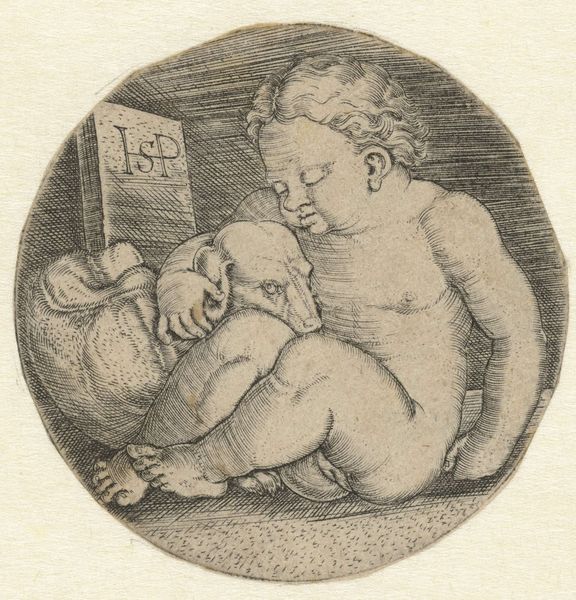 Curator: This quick sketch is called “Bacchus met een kan,” or Bacchus with a Jug, rendered circa 1648 by Harmen ter Borch. It's a Dutch Golden Age ink drawing, currently residing here at the Rijksmuseum. Editor: There's something undeniably tender about this inebriated cherub clutching his drink like a precious secret. The simple ink wash gives him such a soft, dreamlike quality. Curator: Indeed, the drawing technique here is quite fluid, capturing the essence of the god rather than meticulously detailing every feature. Note the jug itself – a simple, rounded form cradled so intimately. Editor: The vessel reminds me of an ancient amphora. And that Bacchus... he seems less about wild revelry and more about quiet contemplation. It almost has a maternal feel, that way he cradles that vessel. I wonder, is he guarding its secrets or its intoxication? Curator: That's a poignant read! The laurel wreath hints at his divine status, of course, but the youthfulness and, frankly, the slightly goofy expression humanizes him. It collapses millennia of iconography. The drawing’s lightness makes you think it’s an experimental sketch from the artist’s journal. Editor: I keep returning to how he holds the jug; there’s such intimacy, trust, dependence… Is it about more than wine? Does the container represent a source of creative power? The "inspiration" artists constantly chase? Curator: A fascinating proposition. Certainly, in alchemical traditions, the vessel holds immense significance. Perhaps Ter Borch, through Bacchus, is hinting at a deeper, transformative process beyond mere intoxication. Editor: So it becomes more than just Bacchus and his booze. It's the essence of capturing something vital. I like that even a small sketch can hold that much interpretive power. Curator: I agree. A seemingly simple drawing unveils surprising depths, doesn't it? And isn't that the magic of art – to hold a mirror up to ourselves through the ages?