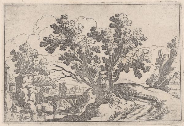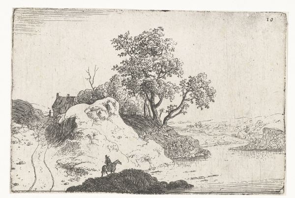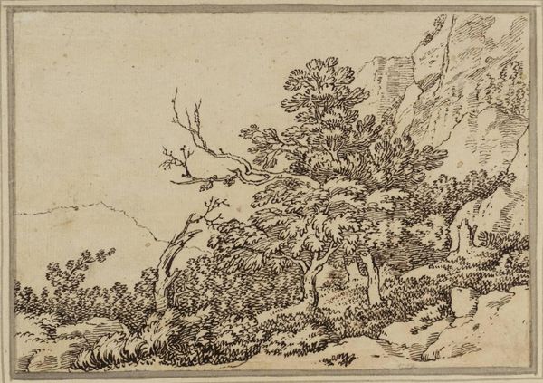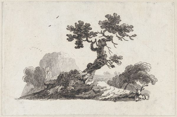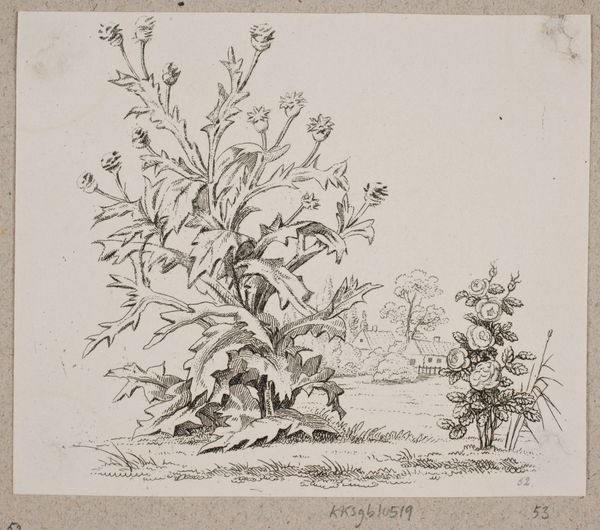 Editor: This is "Twee planten en een kikker," or "Two Plants and a Frog," an etching on toned paper from 1848 by Martinus Antonius Kuytenbrouwer Jr. The rendering is quite delicate, and has an almost dreamlike quality. What strikes you most when you look at it? Curator: What stands out is how this intimate scene operates within the Romanticism movement. While seemingly a simple depiction of nature, Kuytenbrouwer Jr. is engaging with burgeoning ideas of nationalism, of ‘returning’ to the land, or documenting local specificity against rapid urban expansion. The frog, the plants—they become emblems. How do you see the role of such intimate studies of nature in a time of social and economic change? Editor: That’s a great point, I hadn't thought of the wider implications, focusing on the details. It does highlight the beauty of these small, often overlooked, aspects of the natural world. Curator: Precisely. Consider the artist’s choice of etching, a medium accessible and reproducible, it suggests an intention to disseminate this vision of nature, to perhaps foster a sense of collective identity rooted in the land itself. How do you think the tonal quality of the print affects our perception of the scene? Editor: The toned paper softens the image and creates a subtle atmosphere, lending an air of nostalgia. It definitely emphasizes the "romantic" aspects. Curator: Indeed. It allows the artwork to function beyond a mere representation of the physical world; it touches on collective memory. Ultimately, it encourages reflection on our relationship with the environment, a relationship that is itself deeply interwoven with historical and social forces. Editor: This has completely transformed how I view the print; it's far more than just pretty plants and a frog! I see an historical and social argument now. Curator: I think we both now have new layers to consider. Let's remember that our perception of art is ever-evolving and always framed by the context of our own time.