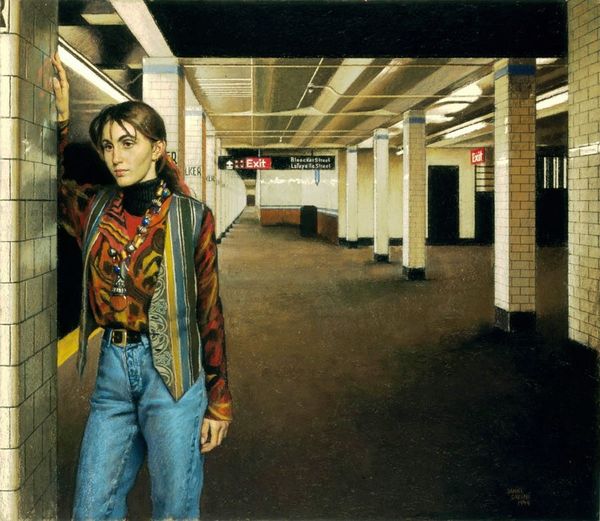 Curator: Tom Wood’s photograph, “East Prescott Road, Knotty Ash,” captured in 1989, presents a multilayered street scene, drawing us into a moment frozen in time. Editor: It feels melancholic, doesn’t it? Like a still from a kitchen-sink drama. The overcast light, that woman's distant expression...it whispers of ordinary lives, burdened, perhaps, but stoic. Curator: Absolutely. Wood's work often reflects the social realities of working-class communities in Merseyside. The composition itself is quite deliberate; the figures are framed by the architecture of the bus stop, even the advertising becomes part of the story. Editor: I’m particularly drawn to the woman at the front. Her face seems etched with a lifetime of stories. The slightly overexposed light on her jacket almost washes her out. There’s this raw vulnerability that just grabs you. Plus, the juxtaposition of her with that androgynous figure in the advert, it hints at a society obsessed with fleeting beauty. Curator: Indeed, the interplay between the woman's individual experience and the manufactured images is compelling. It invites reflection on the commodification of beauty, and on the cultural expectations imposed, particularly, on women. But I also see this image as speaking to broader changes during that decade in the UK. Editor: It's fascinating how Wood transforms what could be an overlooked mundane scene into something quite poetic and socially aware. The layering gives a depth, too—the people behind the woman become shadows, ghosts of passers-by, yet they are vital to capturing a community. It makes me feel like I am waiting there with them. Curator: Agreed. He documents the unsung lives and places with an almost anthropological dedication, a crucial voice in the history of documentary photography in Britain. And yes, I, too, appreciate how this photograph functions as an insightful snapshot of British culture during a specific time and place. Editor: Exactly. It reminds us to look closer at the people and places that surround us, and to find the extraordinary in the ordinary. Curator: It serves as a reminder that art's role extends beyond aesthetics; it has the capacity to foster critical reflection and ignite profound dialogue.