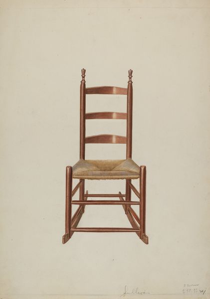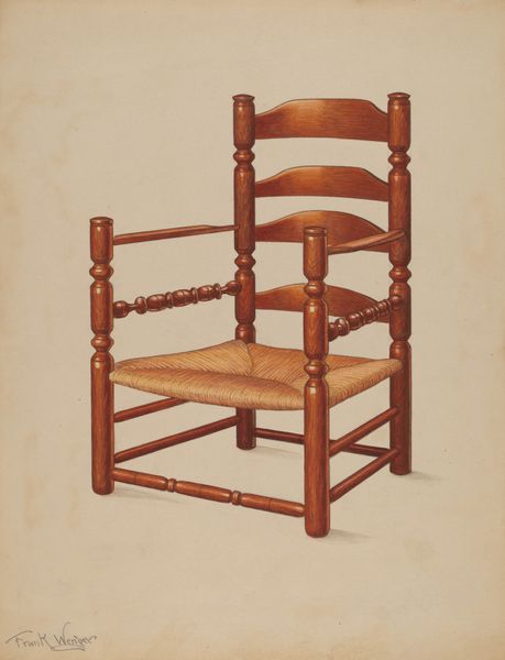 Curator: This is Rolland Livingstone's "Corner Chair," a watercolor on paper created in 1941. Its precision is quite striking, wouldn't you agree? Editor: My initial impression is its domestic tranquility; the chair feels both familiar and unassuming, despite its very formal presentation here. Curator: Precisely! Note how Livingstone deploys watercolor techniques to articulate the chair's textures: the woven seat's complex pattern juxtaposed against the smooth wooden frame. The use of light and shadow delineates form, adhering strictly to academic principles. Editor: And yet, it's the material story I find more compelling. Consider the labor involved—from the harvesting and preparation of the straw to the woodworking of the frame. Each element speaks of handcraft, of a specific skill set developed within a community. Curator: An intriguing point. However, I'm drawn more to the spatial dynamics created by the chair's corner construction. The converging lines establish a clear sense of perspective and depth, while the object's geometric form introduces a kind of restrained elegance. Editor: But the elegance itself derives from that unadorned construction. It is precisely the everyday, functional character of the chair, the very lack of pretension in its making that contributes to its appeal. One might consider the socio-economic conditions under which such chairs were commonly produced and used. Curator: I grant that the work embodies a kind of vernacular aesthetic, but its formal rigor cannot be overlooked. Livingstone focuses our attention on line, form, and texture—qualities that elevate the quotidian to something worthy of careful contemplation. The academic application here is not simply copying the real. Editor: For me, the true value lies not just in its aesthetic form, but in how Livingstone, through his exacting rendition, prompts us to consider the hidden economies of production and the values invested in these handmade objects. I’m also considering its domestic positioning; such chairs speak of cozy rooms, maybe a spot to take off muddy boots and sit. Curator: Your material analysis sheds a fresh perspective. This deepens the complexity and inherent value we see today in such a carefully presented composition. Editor: Indeed, understanding its materiality and its place can reshape how we understand and relate to art overall.