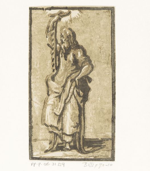 Antonio da Trento created this chiaroscuro woodcut, Heilige Filippus, sometime between 1520 and 1550. Trento, an Italian printmaker, worked during the height of the Renaissance, a period characterized by a renewed interest in classical antiquity and humanism. This print depicts Saint Philip, one of the twelve apostles of Jesus. We see Philip, draped in robes, holding a cross. The halo emanating from his head signifies his sainthood, but it is also the source of light in the piece. The strategic use of light and shadow in the chiaroscuro technique creates a sense of depth and drama, drawing viewers into the saint's contemplative presence. The choice to represent Saint Philip reflects the religious and cultural values of the time. During the Renaissance, religious art served as a means of both devotion and instruction, reinforcing the power and teachings of the Catholic Church. In an era marked by social and political upheaval, the figure of the saint offered a sense of stability and guidance, embodying the virtues of faith, humility, and sacrifice.